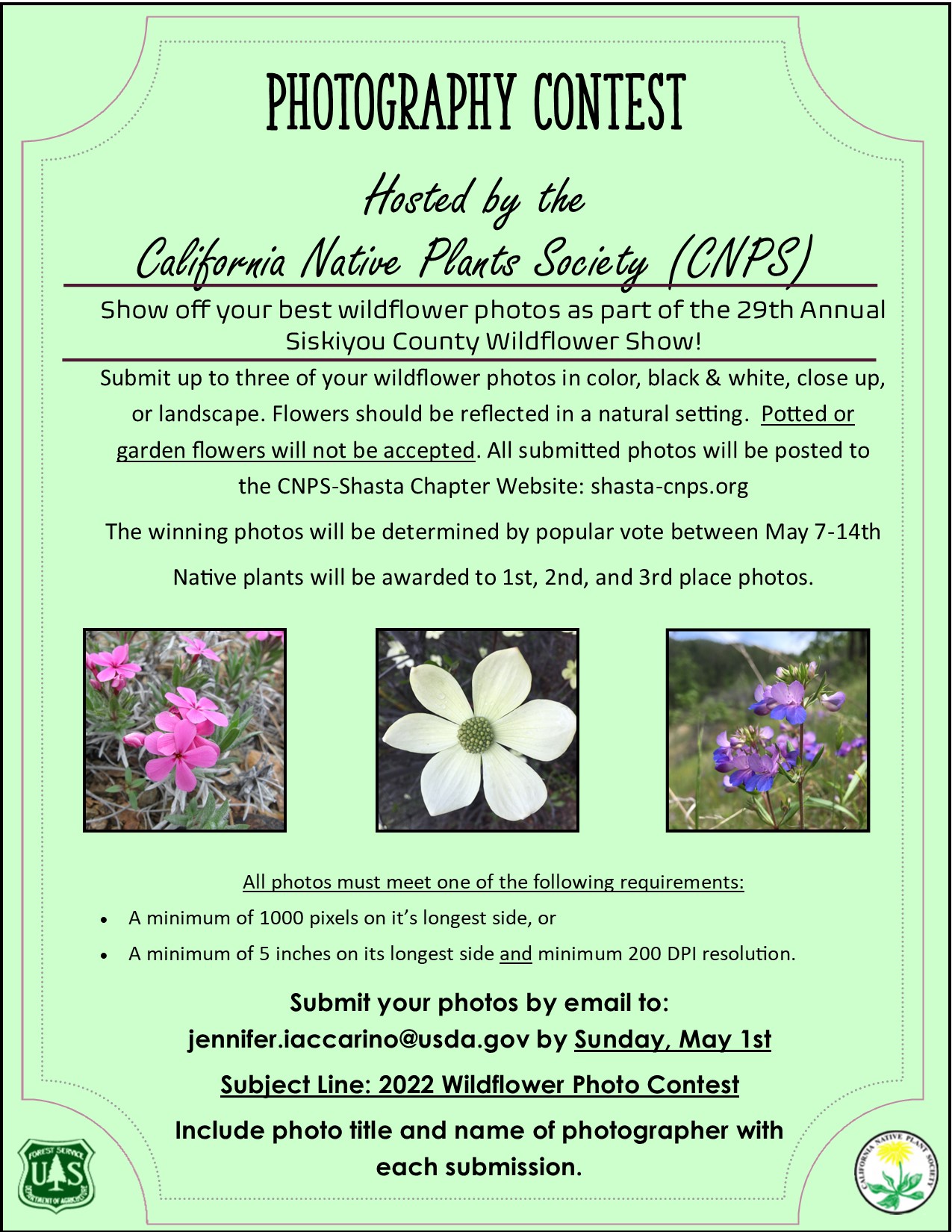 To join the contest, please submit up to three of your native wildflower photos in color, black & white, closeup, or landscape to erin.lonergan@usda.gov.  (Please see photo requirements in the flyer, above.) Live native plants will be awarded for first, second, and third place finishes in the photo contest.