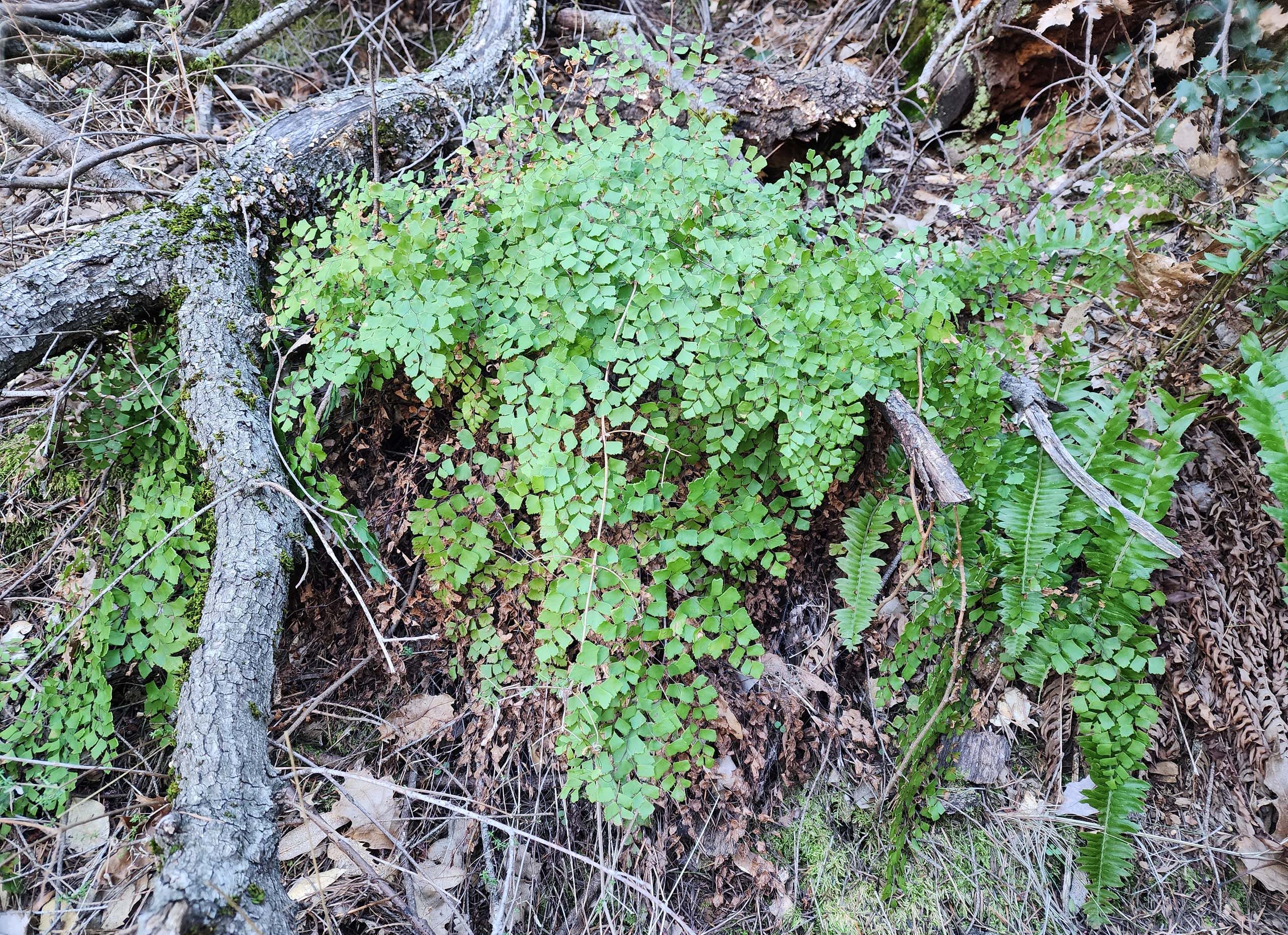 The north-facing section of trail is distinctly more shaded and cooler, has far less diversity, and is heavily forested with conifers. It was along this cooler trail section that we spotted several species of fern, including the winter-active Shasta maidenhair fern.