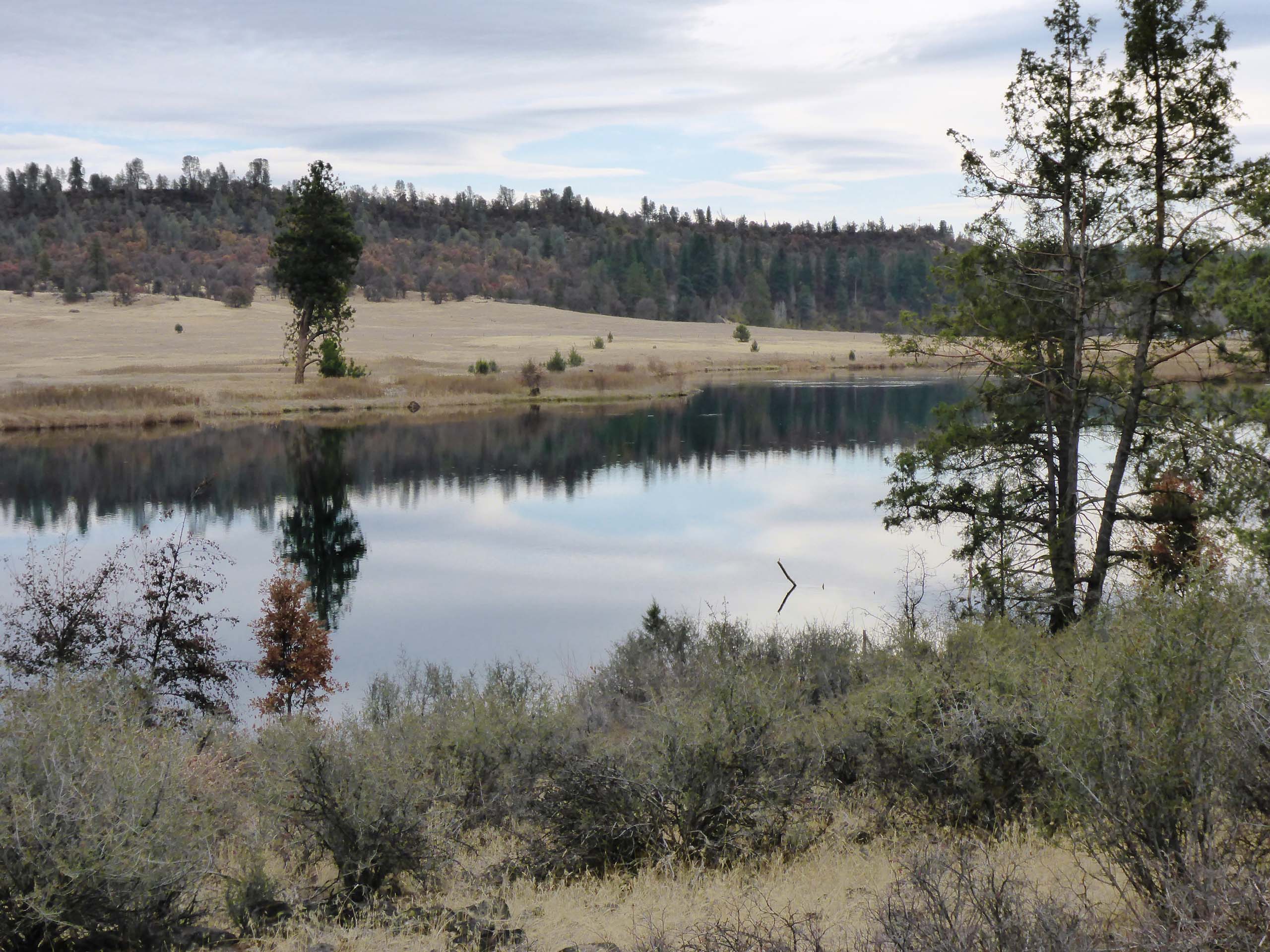 As we dropped down to Baum Lake, avian activity noticeably increased. There is always a myriad of birds at the lake. We saw Stellar and Scrub Jays, Woodpeckers, Robins, Towhees, and many others in the shoreline vegetation; a couple hawks on wing; and Buffleheads, a Pelican, and a Great Blue Heron on the lake itself.