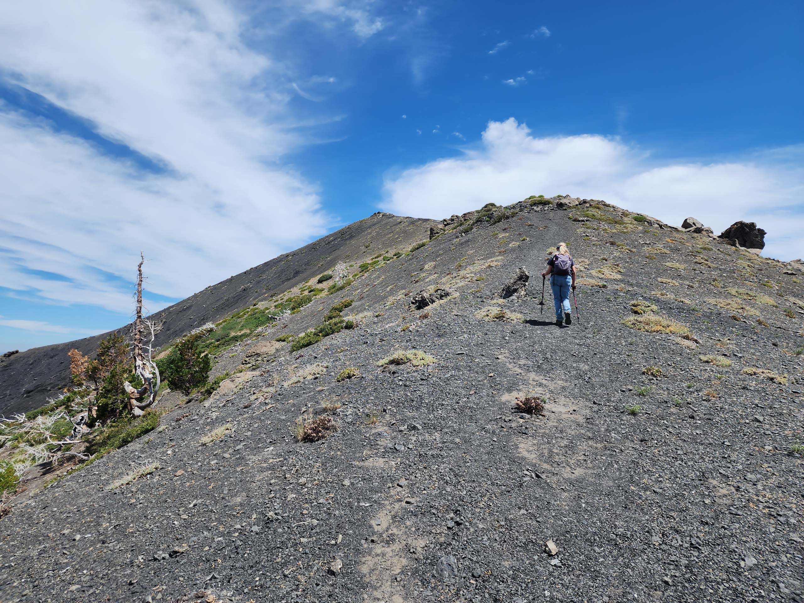 We chose to hike Black Lassic first. While the peak looks daunting from a distance, its southwestern nose provides a fairly gentle slope to the top. The real challenge in scaling this peak is figuring out how to get there. There is no official trail so, never having been there before, we just parked on the road and took off. We now know that there is a right way and a wrong way to get there. The right way includes taking a side road to a parking area and finding a use trail that follows a drainage along the western foot of Black Lassic to the southwestern ridgeline.