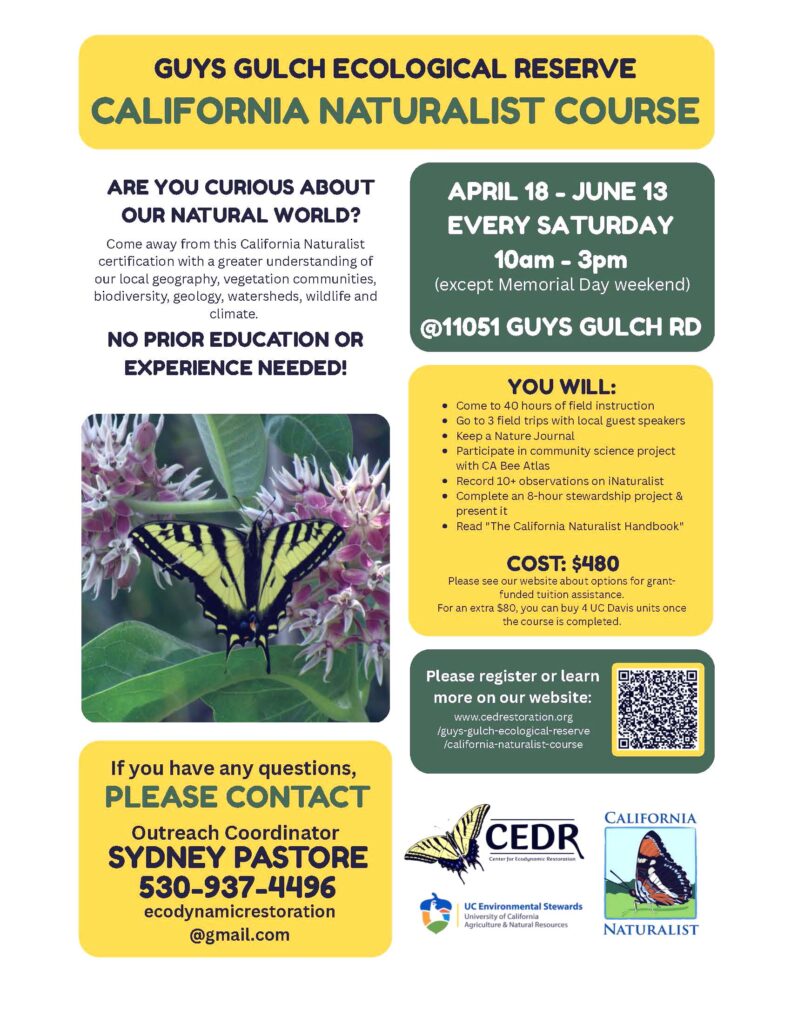 Soon, on Saturdays starting April 18 through June 13, the Reserve will host the northernmost California Naturalist Course, with all instruction taking place in the field. California Naturalist is a 40-hour generalist naturalist certificate program, organized and accredited through the University of California system. The California Naturalist class at the Guys Gulch Ecological Reserve will focus on the Klamath Mountain region, part of the Klamath Knot—a biodiversity hotspot that has been proposed as a UNESCO Biosphere Reserve. Students will participate in the California Bumble Bee Atlas or the Integrated Monarch Monitoring Program, in addition to implementing a stewardship project of their choice on the Reserve or in the community. Field trips will focus on the unique geology and water resources in this region. Local experts will highlight their work in natural resource management and conservation, including a native plant propagation nursery, a beaver dam analogue installation, and the local prescribed burn association. This course is for anyone, of any age, who wants to learn more about our natural systems here in Northern California, connect with other naturalists, and steward the land. Come become a certified California Naturalist with us!