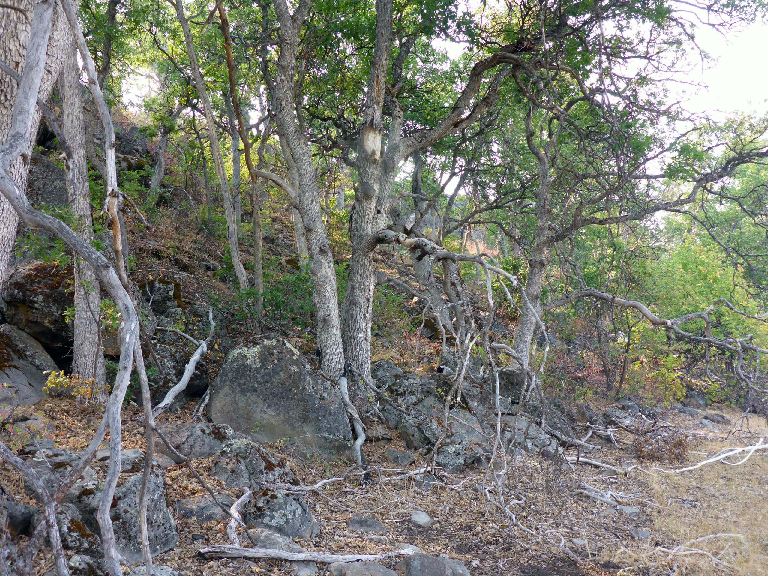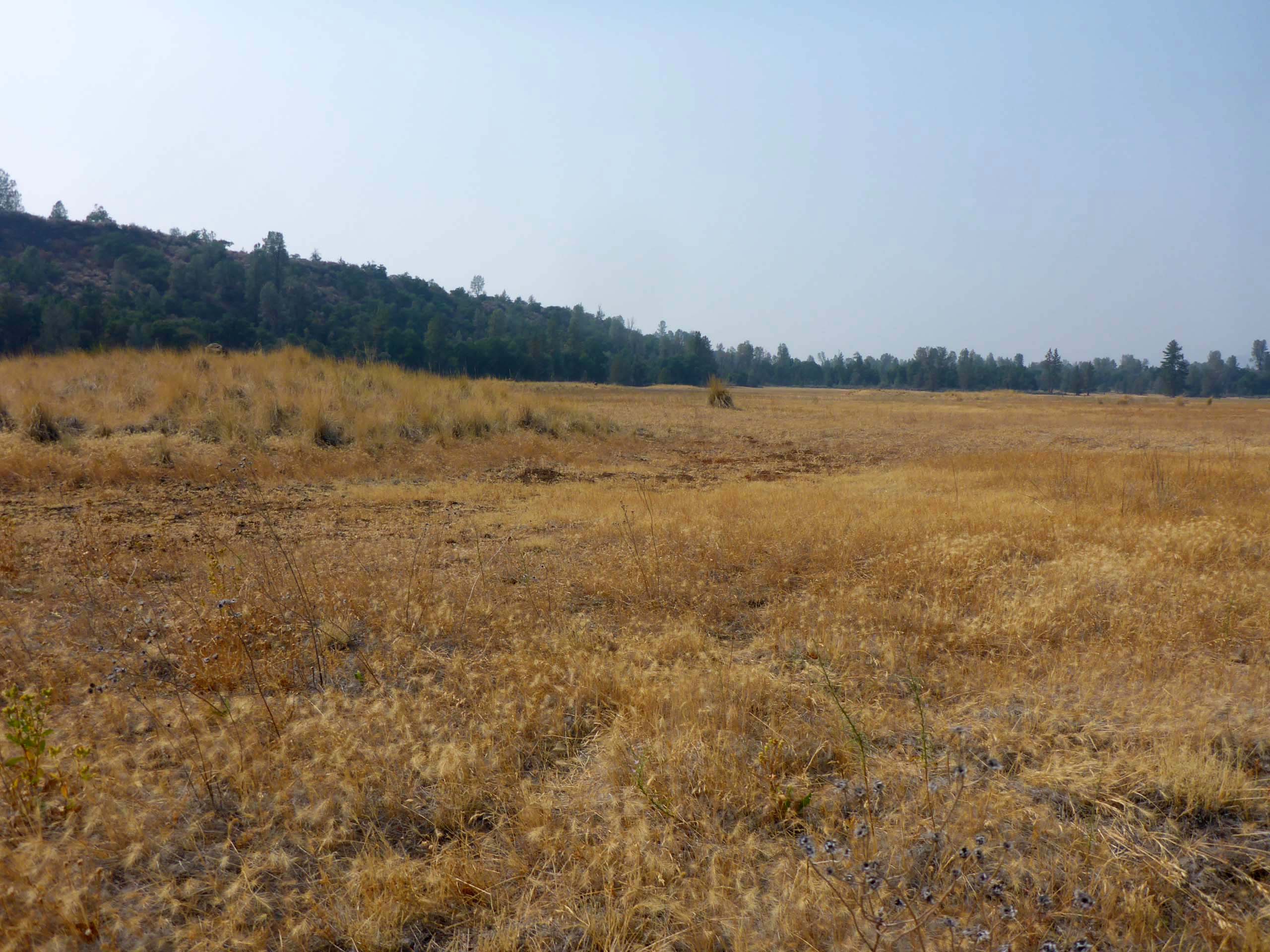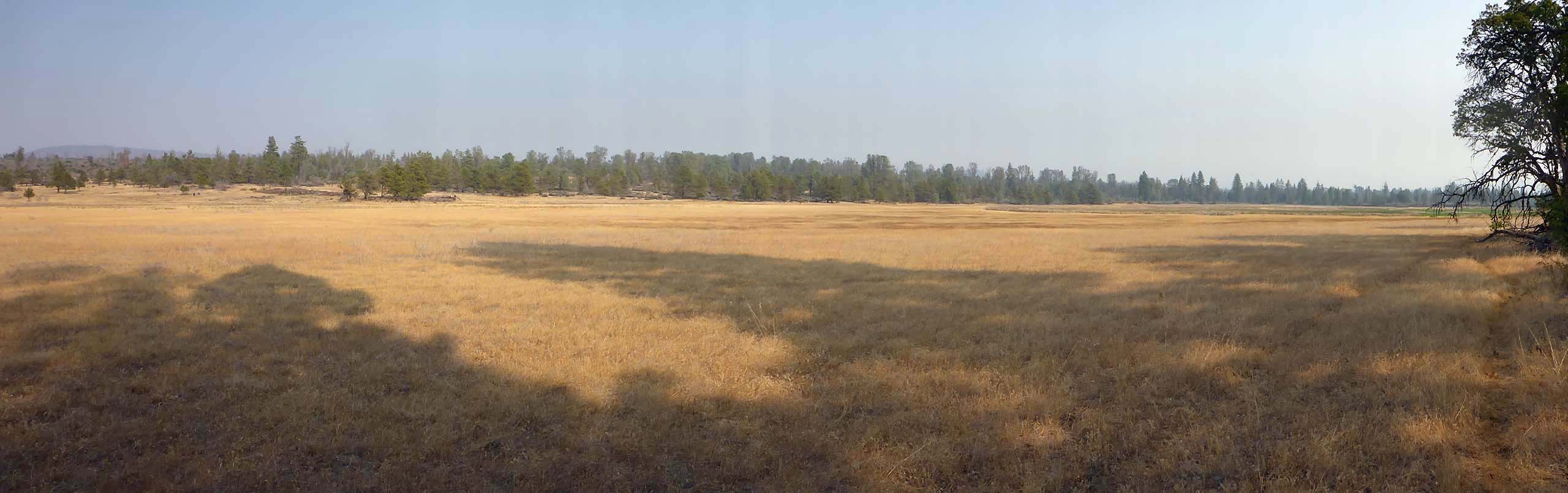 These wetlands run approximately north and south a full mile through the center of the wildlife area, flanked on the west side by a lovely rocky ledge vegetated in ponderosa pine, oak, and a smattering of ash. Across the relatively narrow flats of the wetlands, on their east side, the vegetation is strikingly different, composed mostly of gray pine, juniper, and buckbrush. Two low dams have been installed across the wetlands, as well as several hillocks in the most northern wetland that provide nesting habitat for waterfowl.
