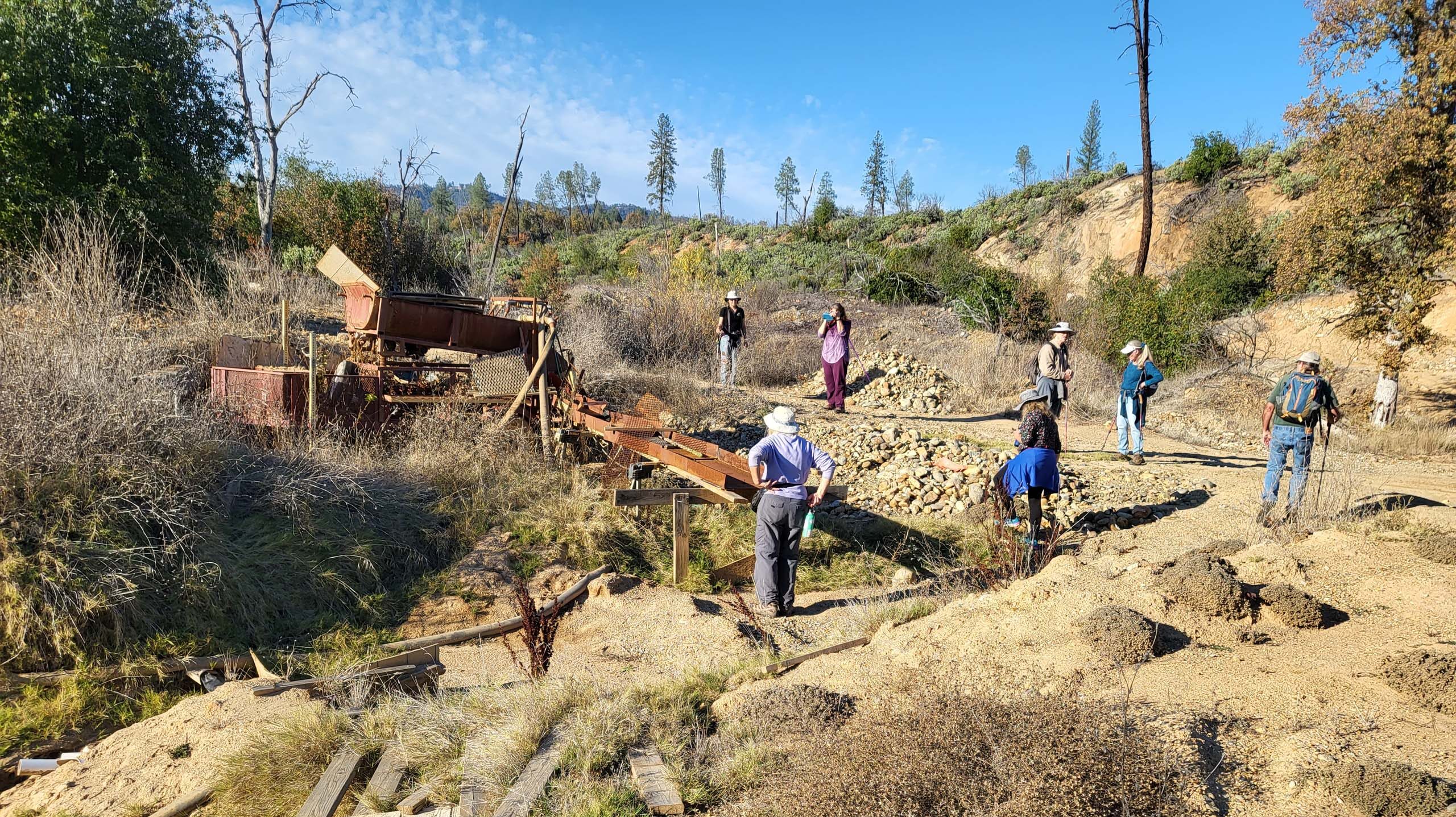 We hiked for a couple of miles upstream, crossing Clear Creek Road at one point, and veering off to the northwest to see some silverback fern (Pentagramma pallida), which is very uncommon in Shasta County. To get to the fern, we passed by some gold-mining equipment that is apparently still in use, despite its derelict appearance.