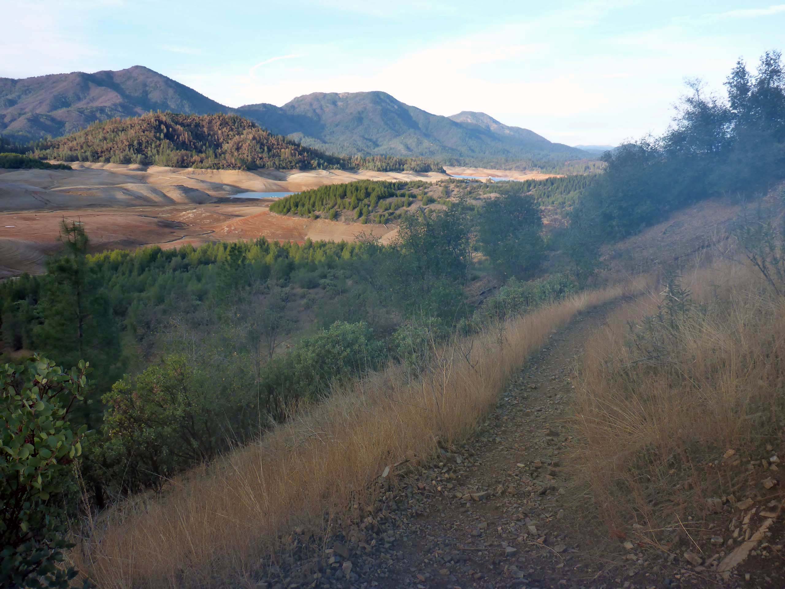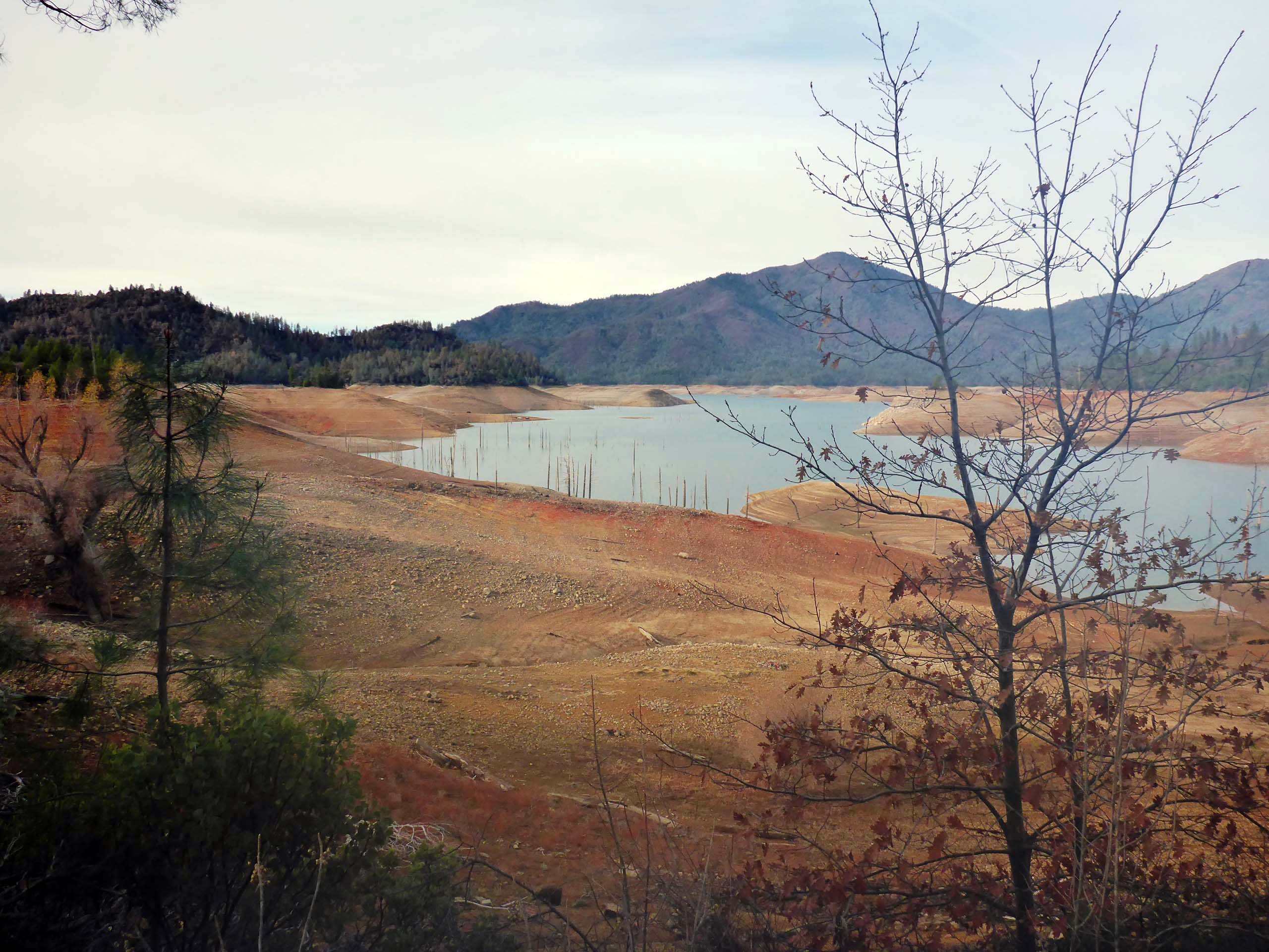 A good thee quarters of the trail follows the undulating shoreline of the Pit Arm of Shasta Lake. When we took this hike, the lake was very low, exposing snags of trees that were killed when the lake was formed.
