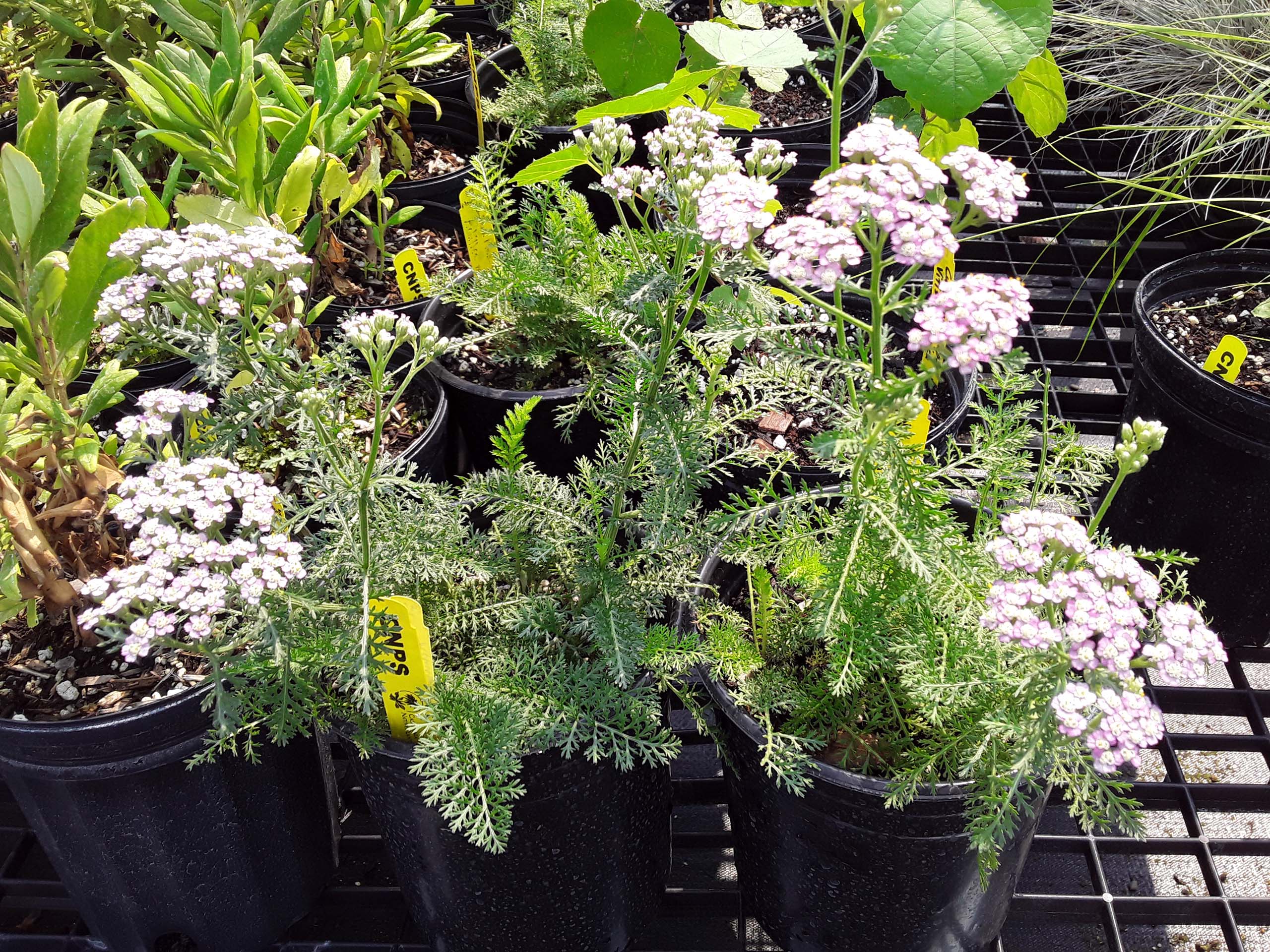 Very easy to grow in the garden, common yarrow (Achillea millefolium) is a low-growing perennial that will spread slowly, forming a loose mat of scented, ferny green leaves. The white flowers are produced in clusters on foot-tall stems and are very attractive to a variety of insect pollinators, including bees and butterflies. Despite the delicate appearance of the leaves, this is a tough plant. Yarrow tolerates a broad range of garden conditions—it is happy in sun or part shade, and will grow in clay soils. It likes low to moderate water in summer.