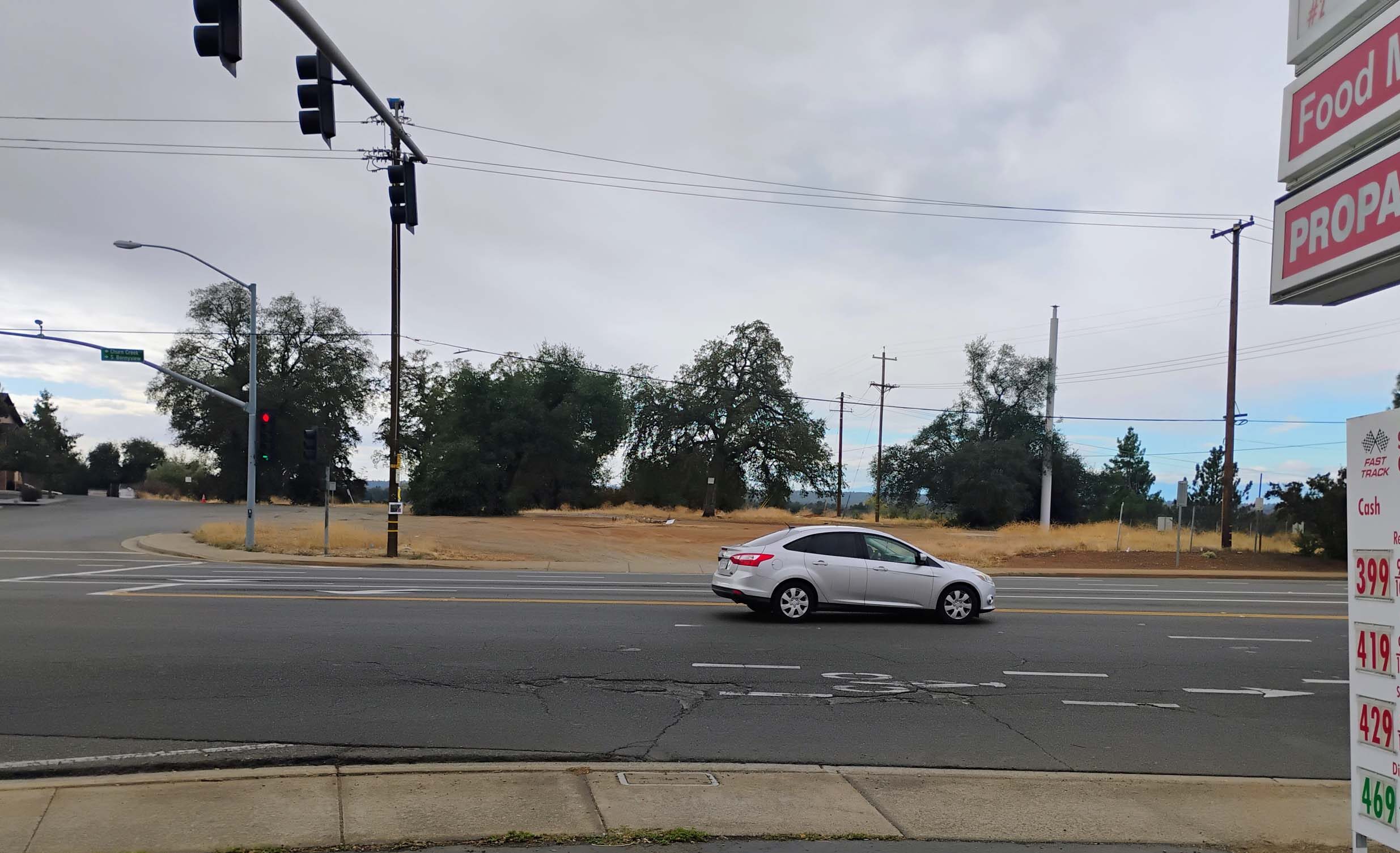 Corner lot where a gas station will be built on Churn Creek Road, where it ends at Rancho Road, next to the north-bound I-5 off ramp, Redding. Photo taken October 28, 2024, by David Ledger.