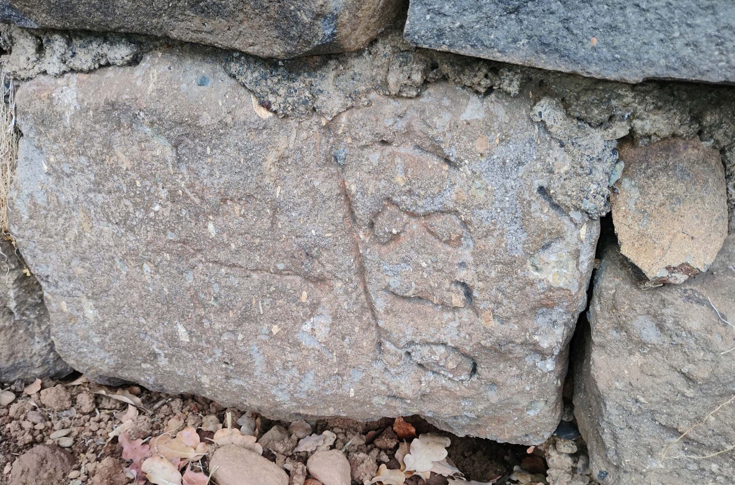 “1870” chiseled into one of the stones used to build a retaining wall on the site where a new gas station will be built, on Churn Creek Road, Redding. Photo taken November 2, 2024, courtesy of SEA.