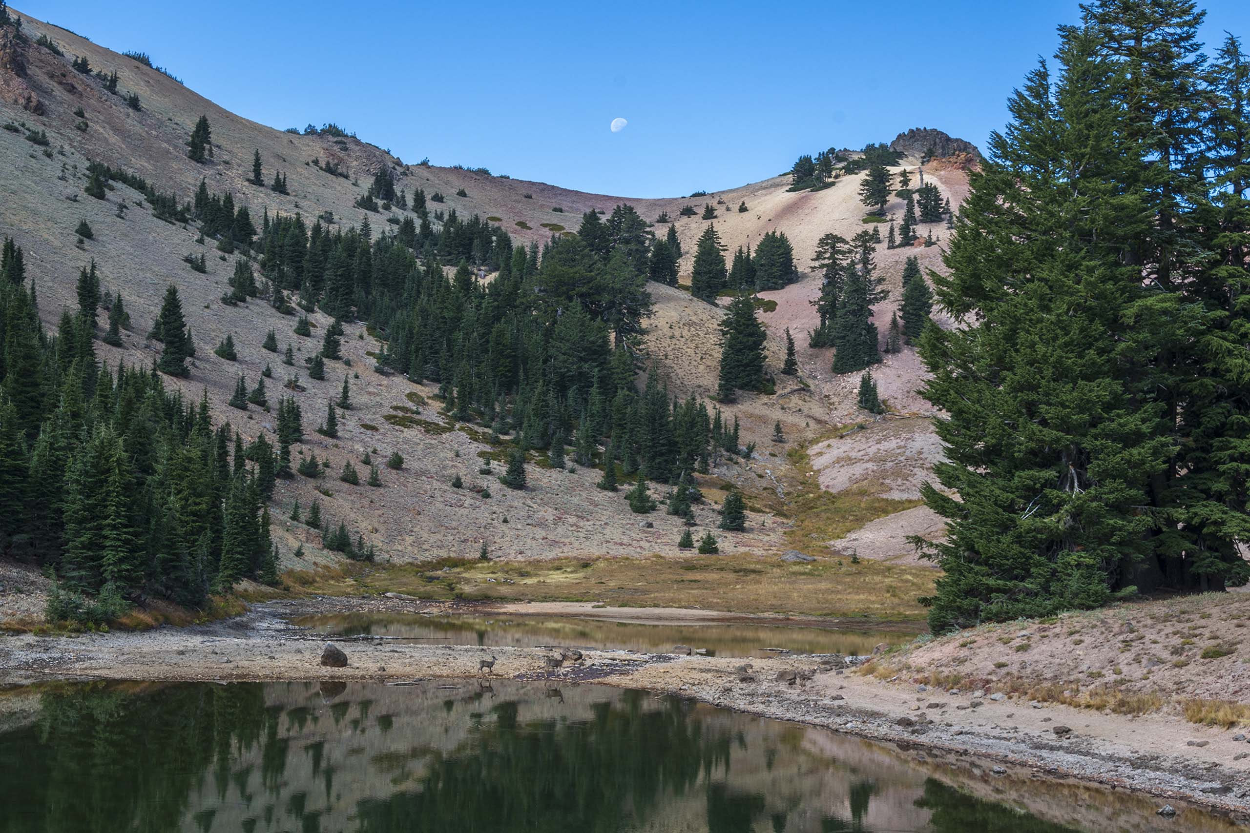 In the Sierra Nevada, this lake would be surrounded by vertical granite walls. Since the volcanic rock at Lassen Volcanic National Park is much softer than granite, the lake is surrounded by steep scree slopes.