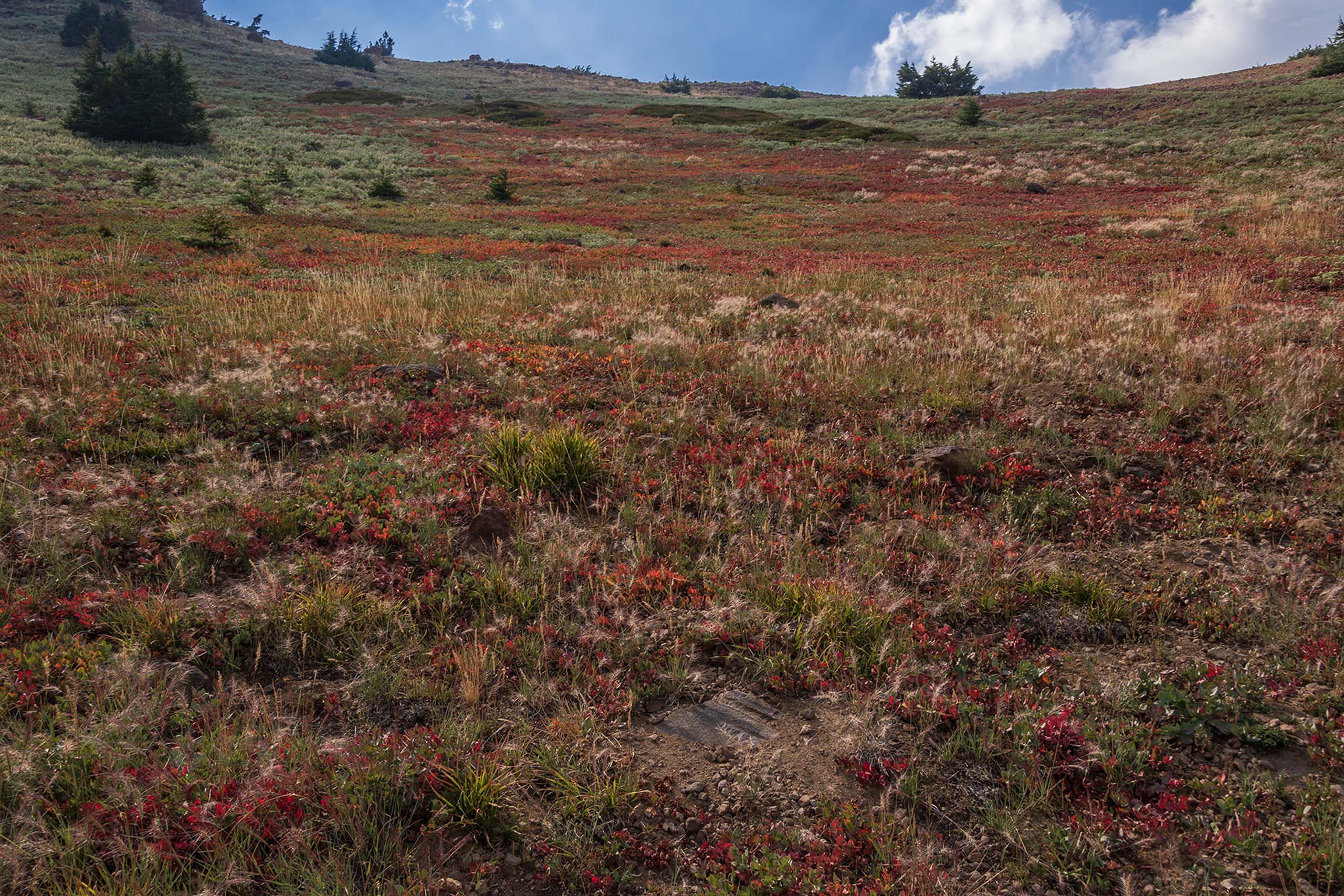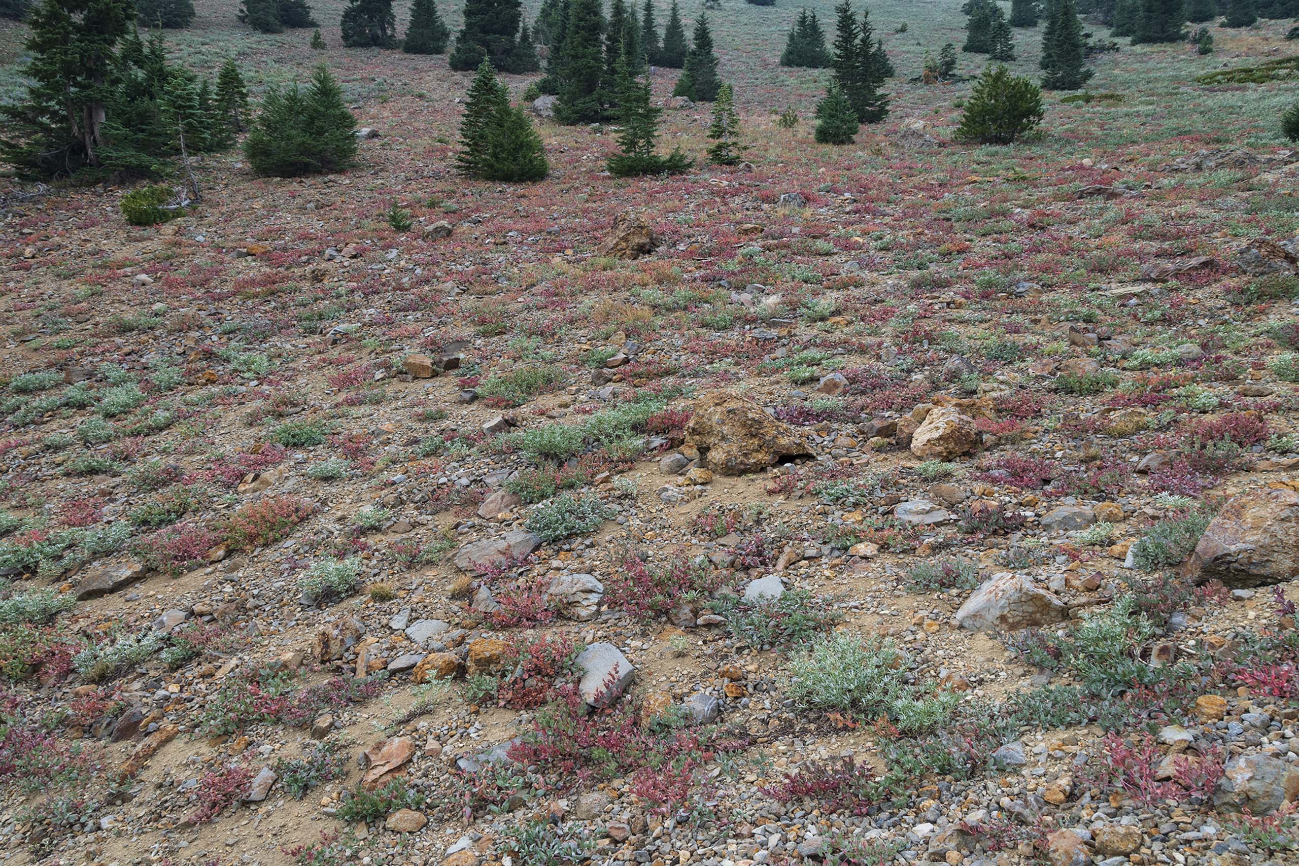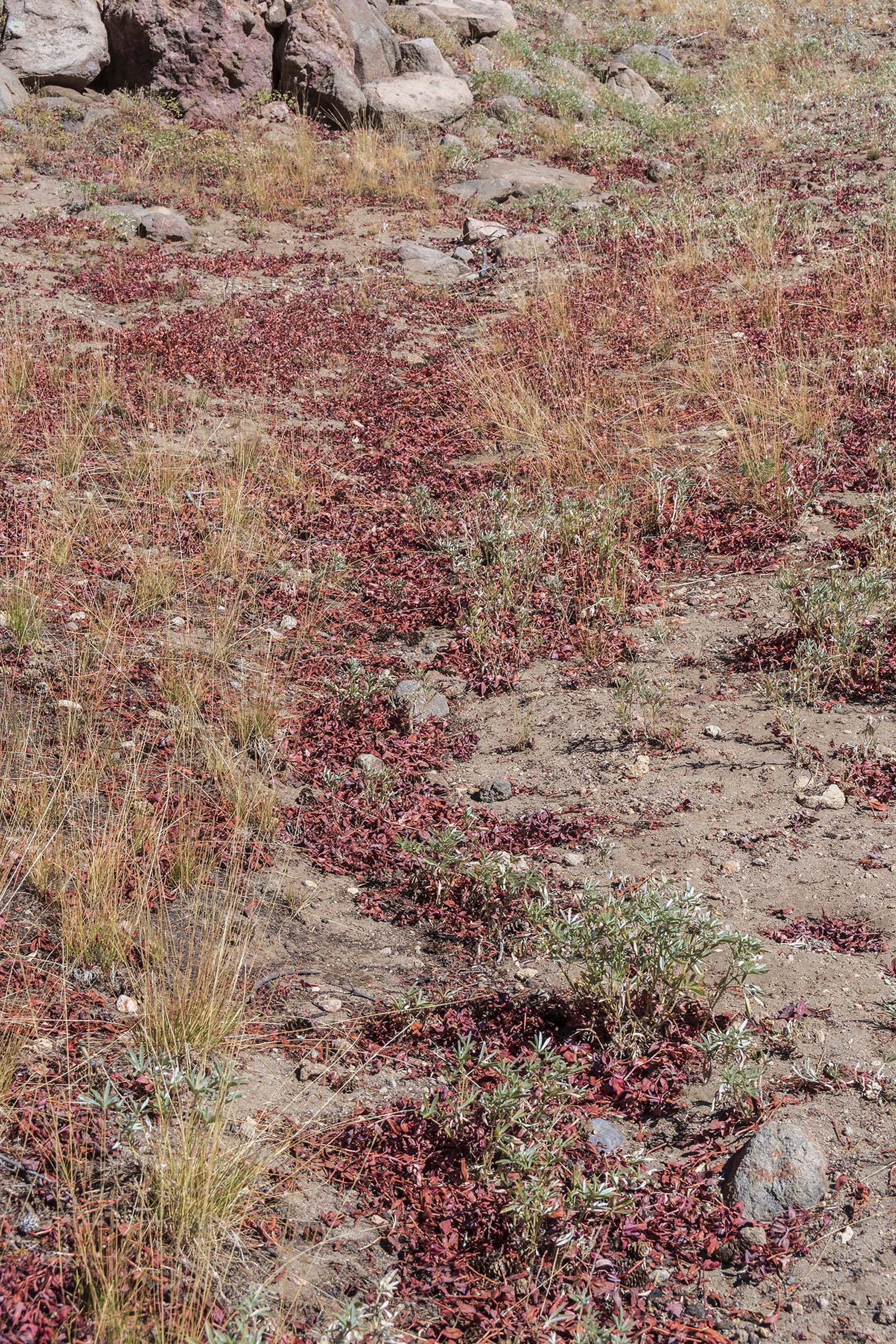 Davis’ knotweed in dormancy will provide a beautiful fall-colors display. What’s all the green stuff? It is mostly satin lupine. Photo taken August 25, 2020.