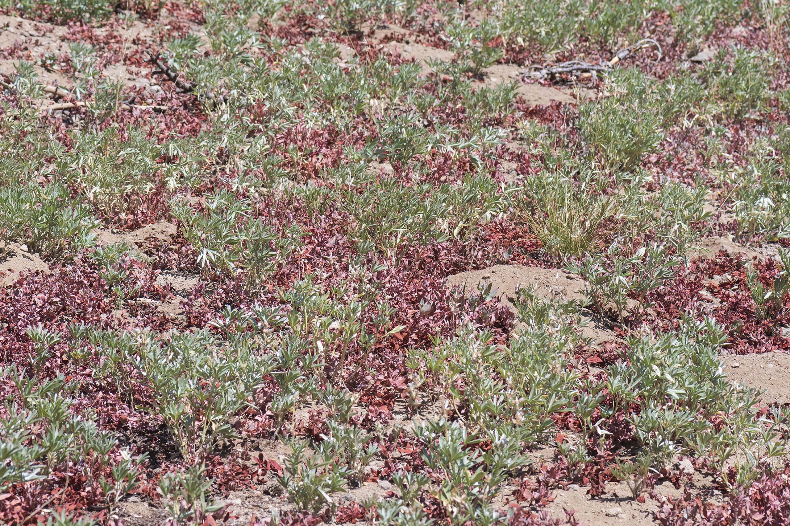 Close-up of slope with dormant Davis' knotweed and satin lupine. G. Lockett.