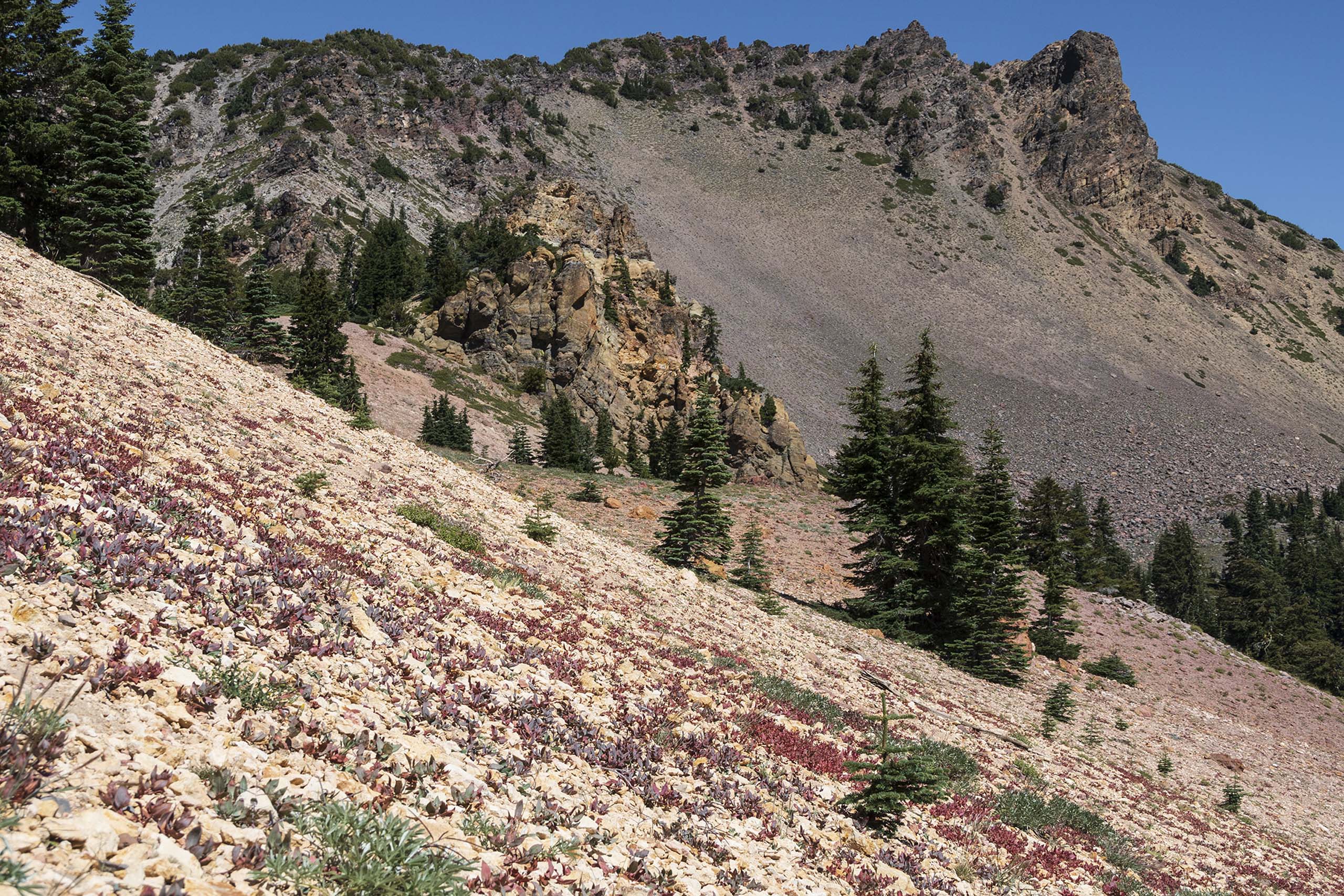 This is the story of a particular plant in a particular place. The plant is Aconogonon davisiae, a.k.a. Davis’ knotweed. Davis’ knotweed is a hardy, high-elevation herbaceous perennial of the central and northern Sierra Nevada, the Cascades, Klamath Mountains, and North Coast Range.  Although it can occasionally be found as low as about 5,000 feet in elevation, it is most common above 7,000 feet, where it inhabits scree slopes, gravelly ridges, dry open flats, and open forests.  A member of the Buckwheat Family (Polygonaceae), Davis’ knotweed, with its drab and unassuming flowers, is easily overlooked all summer long—but in the fall, it can provide spectacular displays.