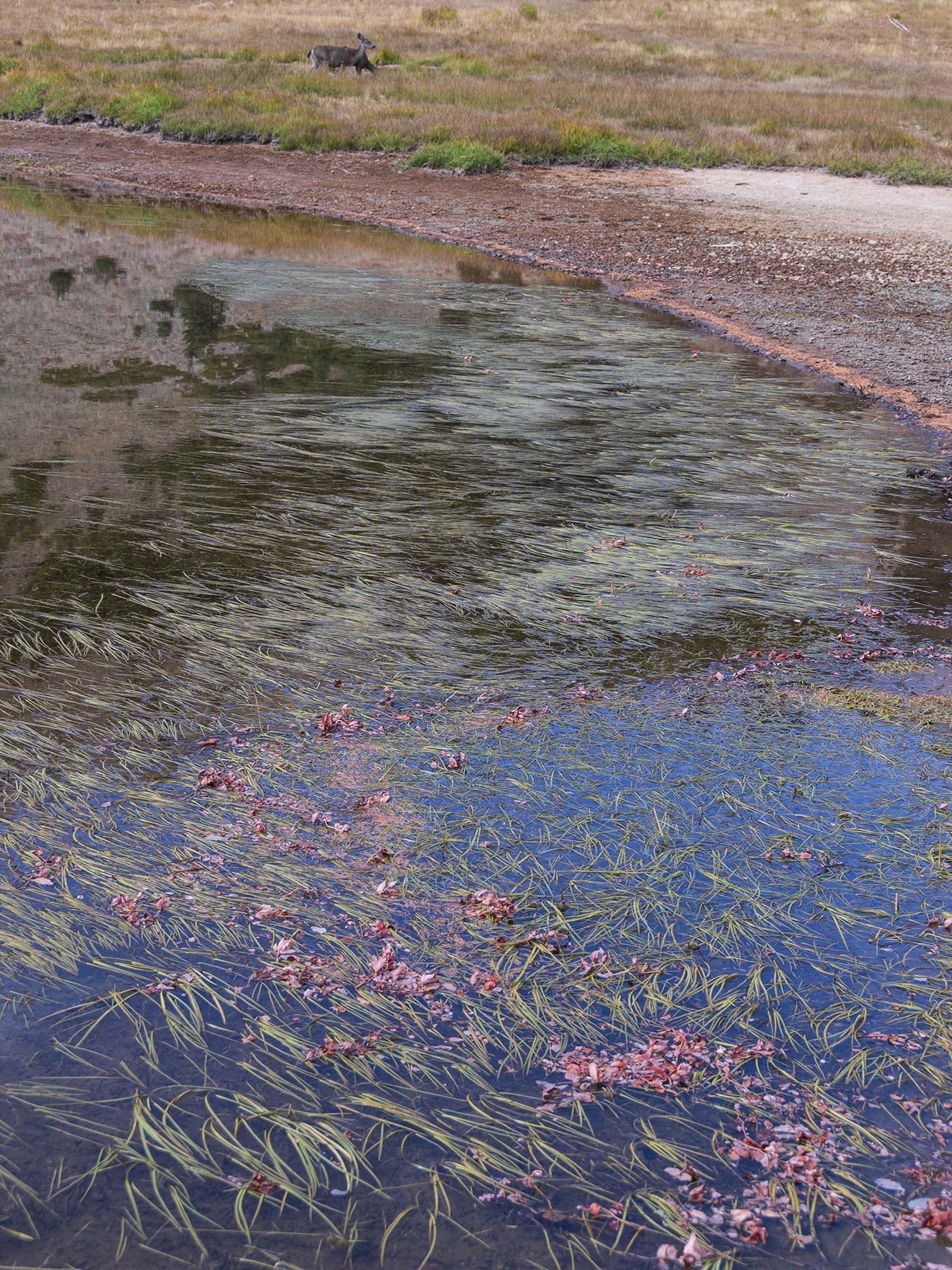 I have reversed positions from the previous picture. I am down by the lake looking back at the ridge where I took the last photo. This photo was taken in the fall, on October 7, 2020. There are nominally two lakes. The lake level has dropped enough for a “ridge” to surface, creating the appearance of two lakes. For scale, note that there are two deer on this ridge.