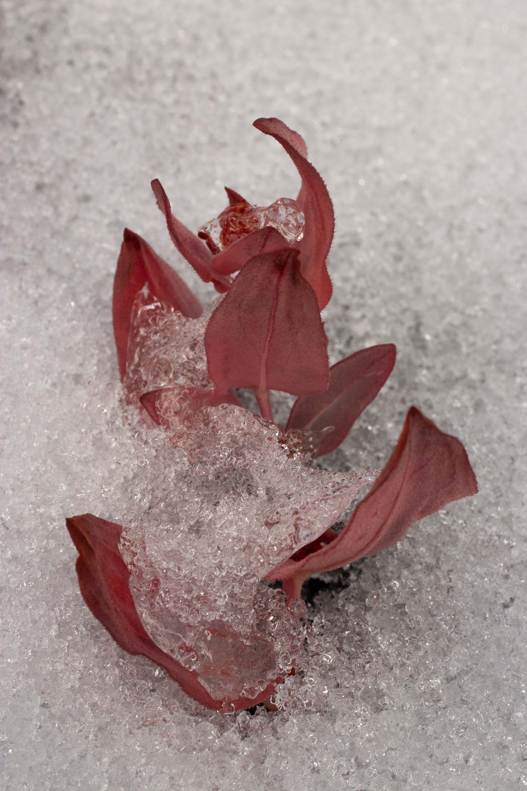 This plant is interesting for many reasons. For one, it uses the “snow lily strategy” of pushing through the snow (or ice) ASAP in the spring. It relies on anthocyanin “antifreeze” to avoid damage to tender shoots from low nighttime temperatures or unexpected cold snaps. As a result, the first shoots to push up are deep red with a viscid, almost slimy, quality, which is very striking.