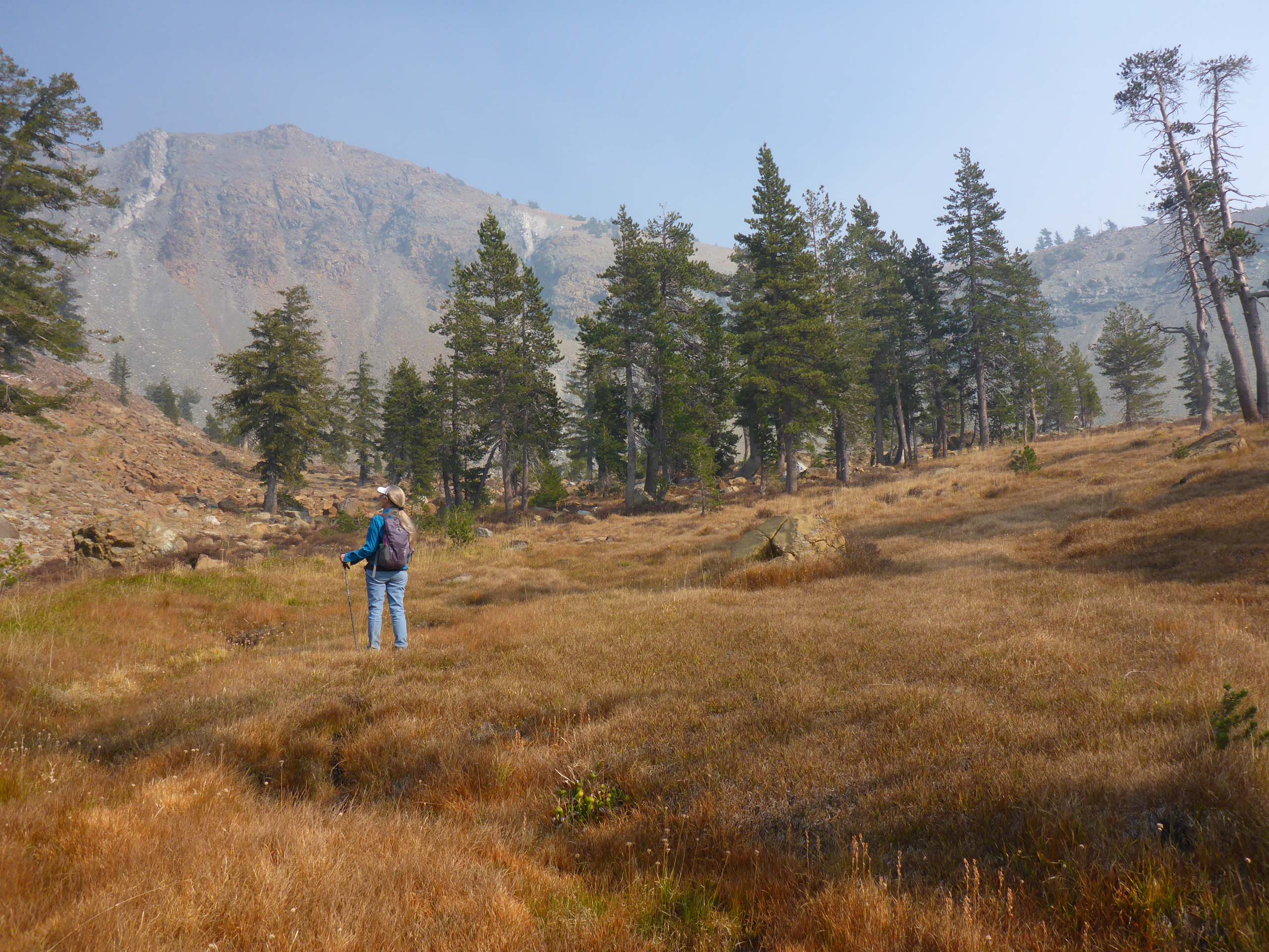 Instead, we poked around in the meadow above Upper Deadfall Lake, where little streams flow, nearly hidden by the grasses, and foxtail pines become prevalent.