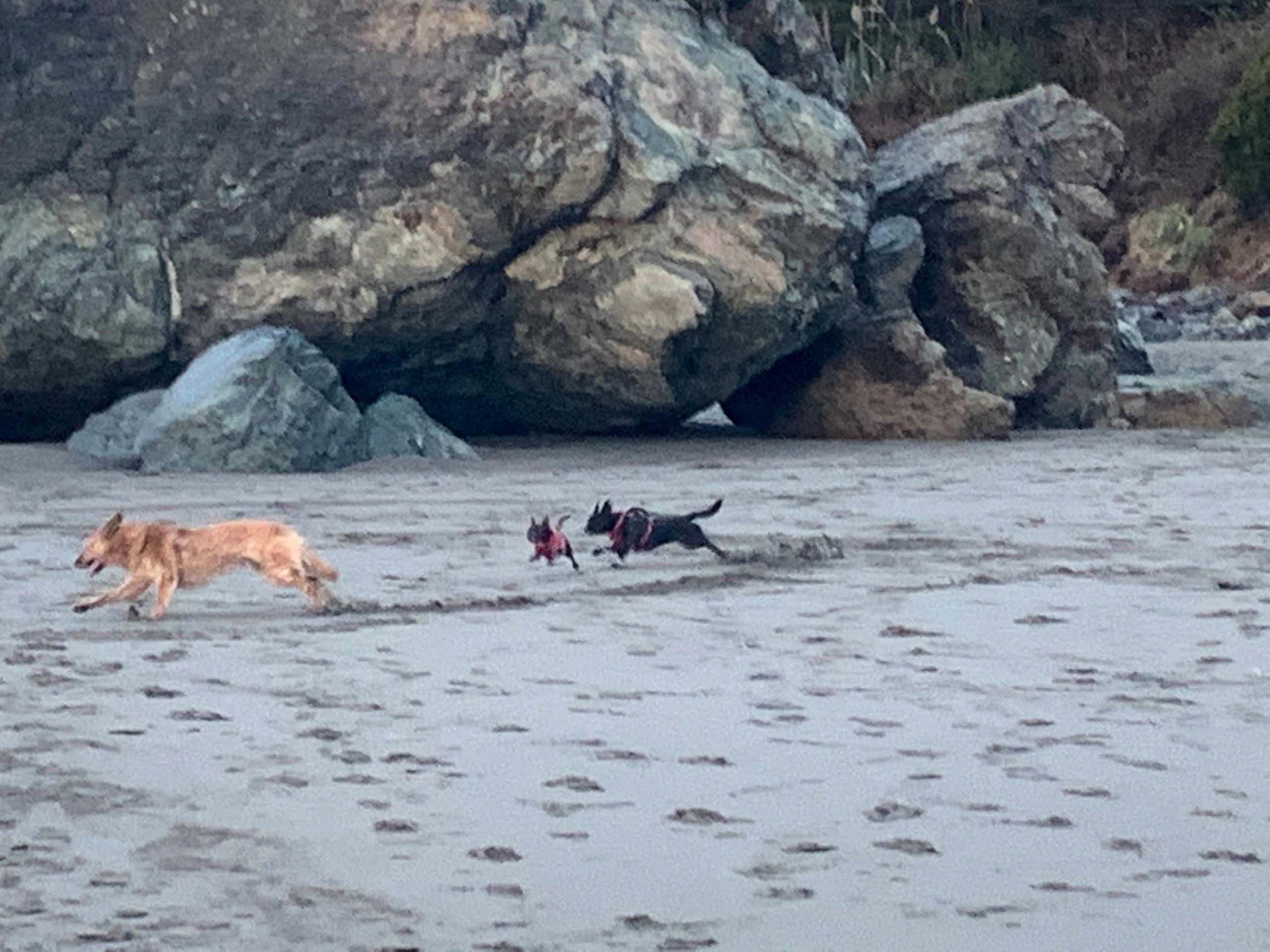 Once again the ocean and coast were calling to us—just as the mountains do from time to time! So, we hitched our trailer to the pickup, gathered dogs Tiny and Baxster, and headed for the Emerald Forest Campground just north of the small town of Trinidad. Three hours later, we popped up our tent trailer and headed for an evening walk on beautiful Trinidad State Beach, where Tiny and Baxster found a friendly dog to chase and be chased by.