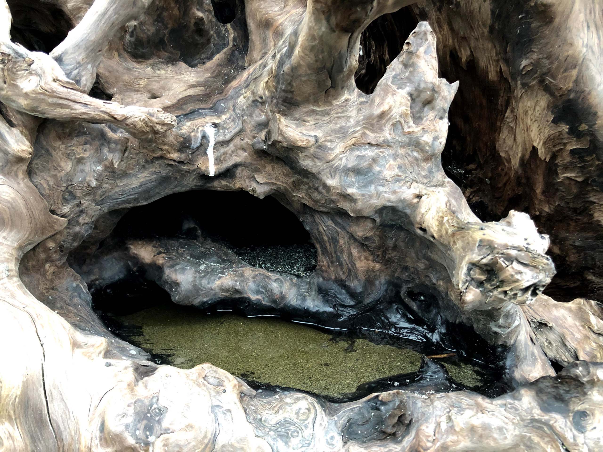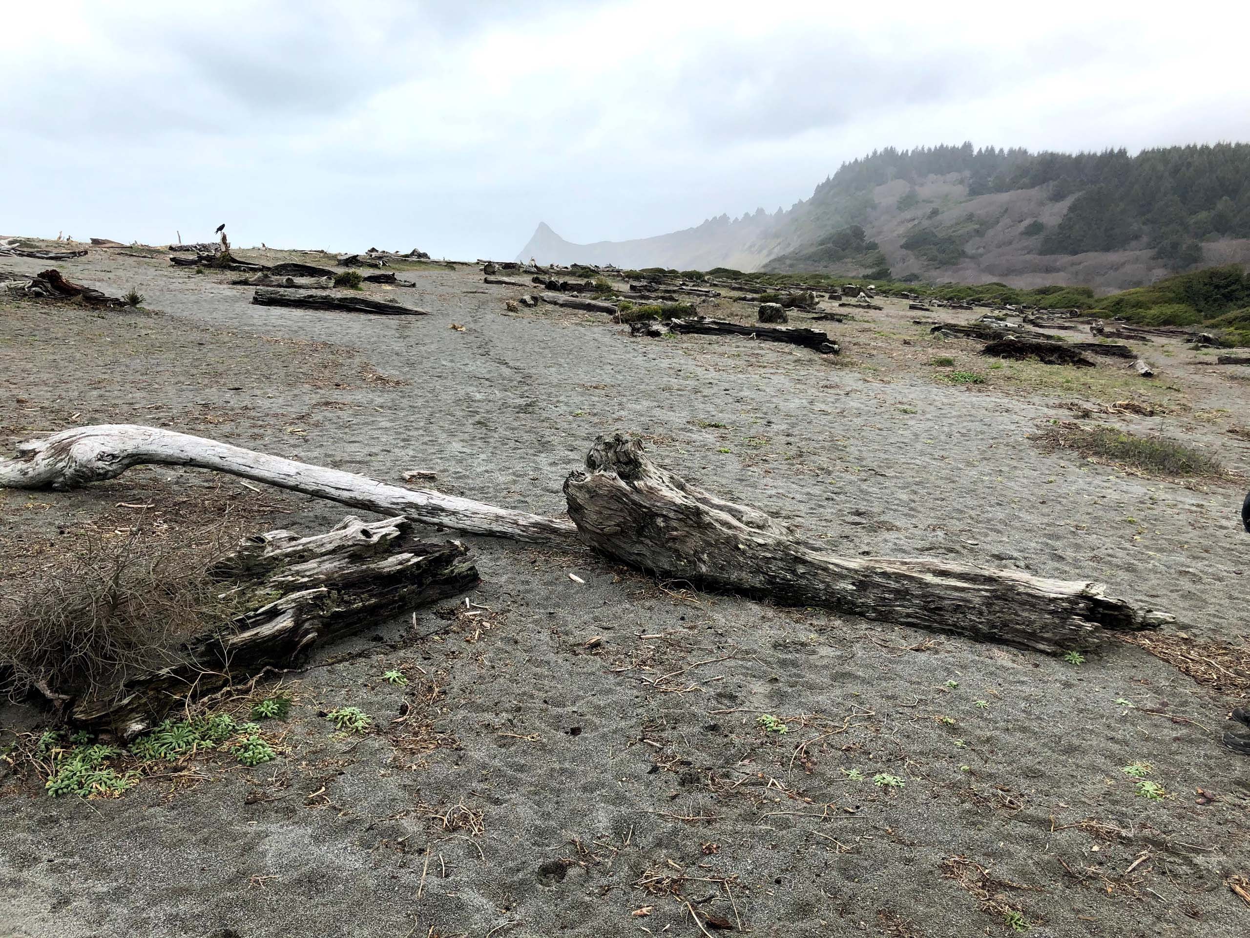 The next morning after a late breakfast, we drove north on Hwy 101 for about 20 minutes and found Dry Lagoon. The trail to Stone Lagoon begins with a quarter-mile hike on the beach, heading north. The beach is littered with many interesting old tree stumps and logs that the ocean waves have deposited over the years.
