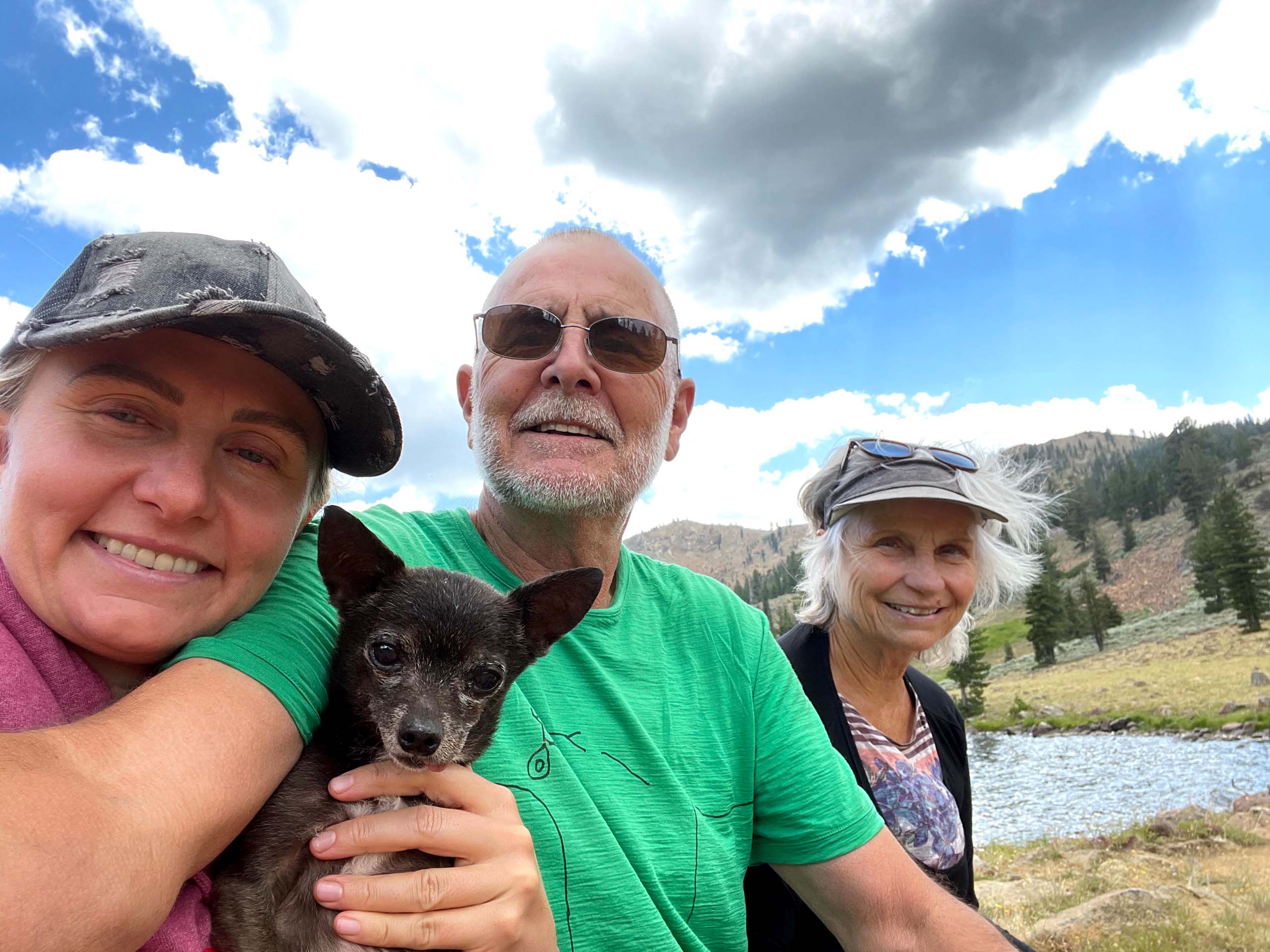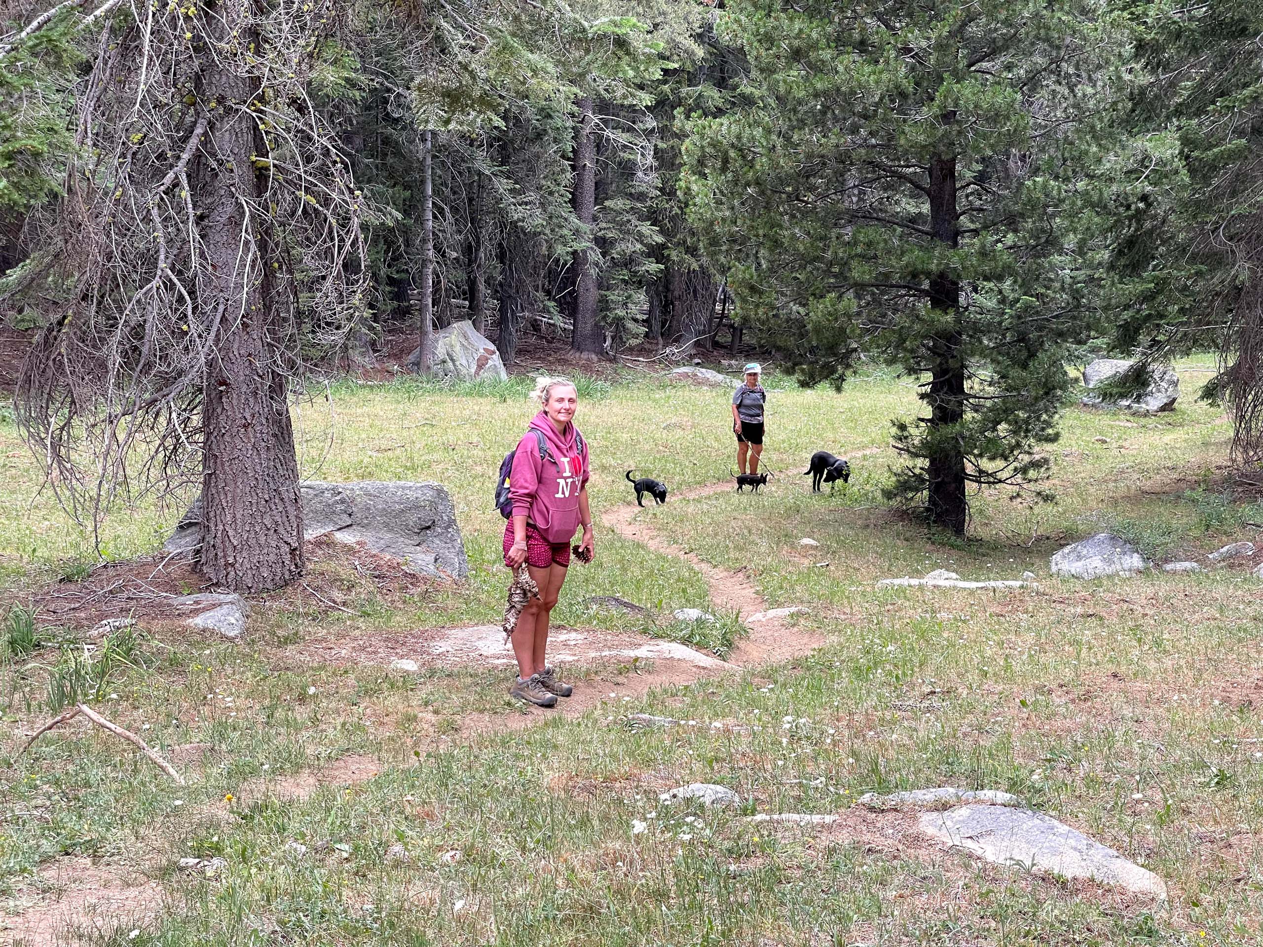 My wife Billie, daughter Ciara, three dogs, and I piled into my pickup at 9:00 on a Friday morning and were on the trail to East Boulder Lake in the Trinity Alps Wilderness, Klamath National Forest, by noon. The out-and-back route roughly parallels East Boulder Creek and climbs from an elevation of approximately 5,750 feet to 6,676 feet at the lake—which, at 32 acres, makes it one of the larger lakes in the Trinity Alps. The round-trip distance measures 5.2 miles.