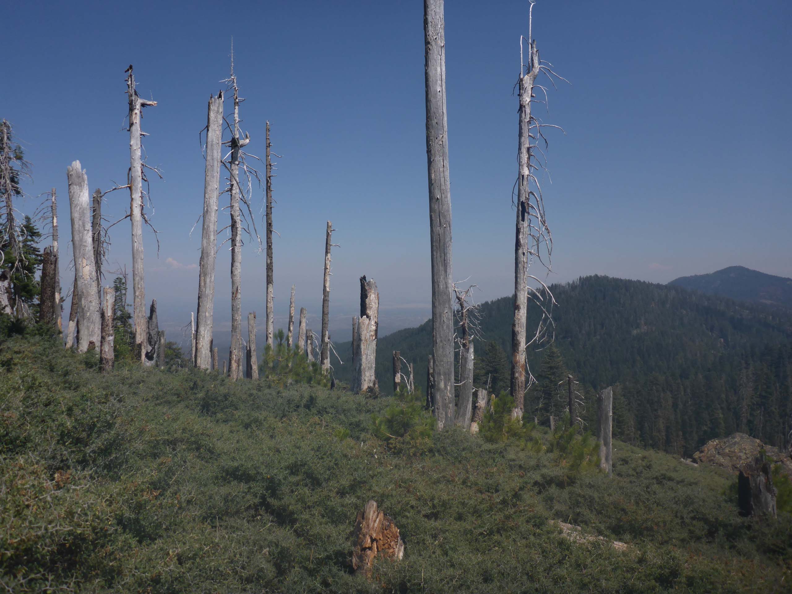 This is about as far as we got on our attempted hike to East Low Gap, which is beyond the next mountain, as far as we could ascertain. Note the impenetrable masses of whitethorn. Tomhead peak at far right. Looking east into the smoke- and smog-filled valley on a very hot July 19, 2020. Photo by Don Burk.