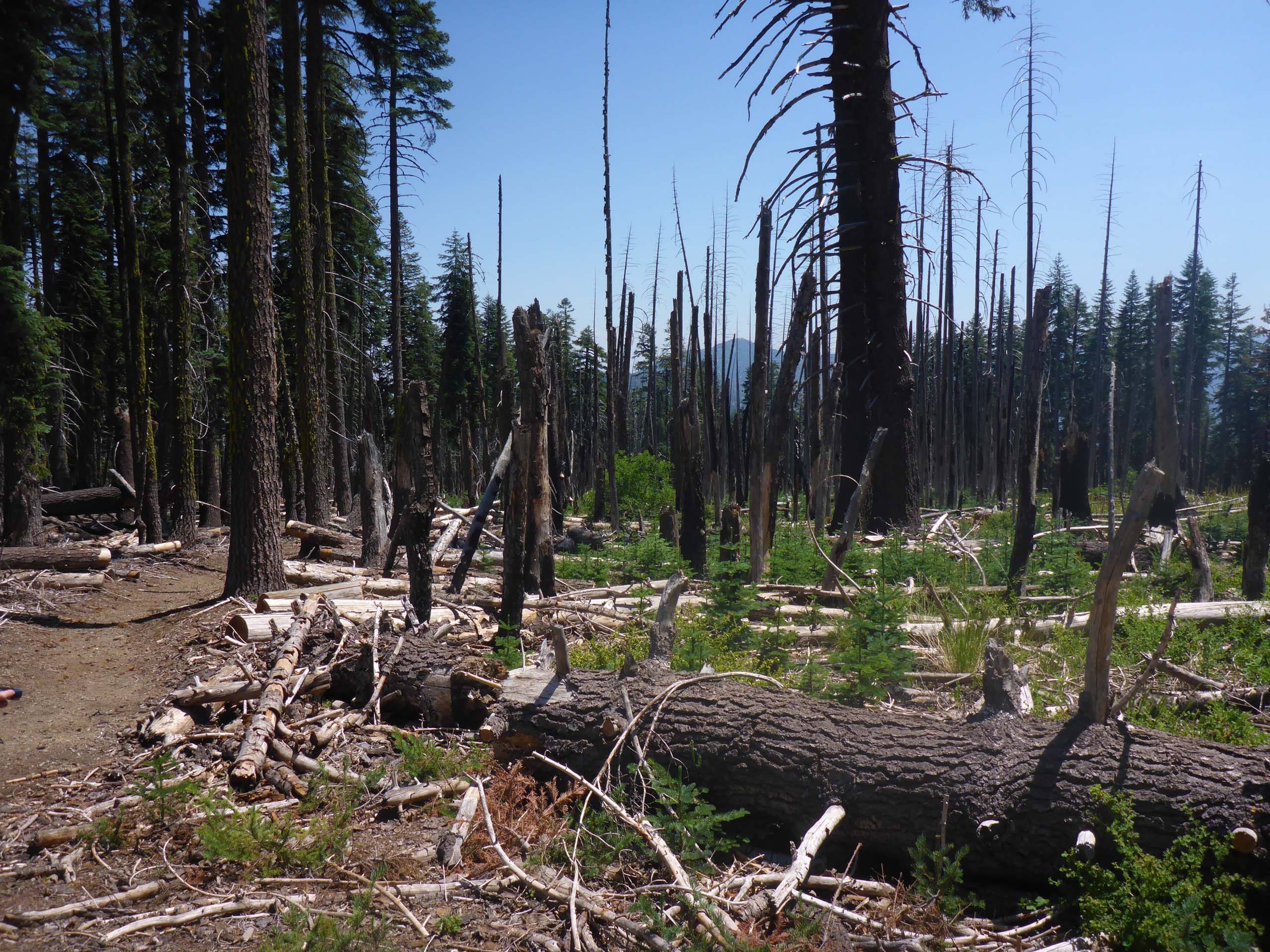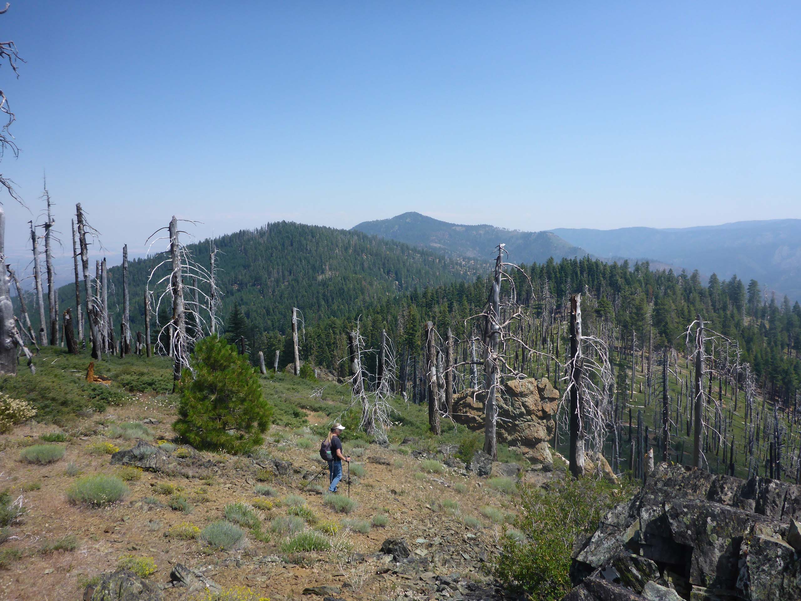 A restored section of Cold Fork Trail, heading east to East Low Gap, can be see at the left of this photo. This ridgetop is recovering from a 2008 fire. July 19, 2020. Photo by Don Burk.