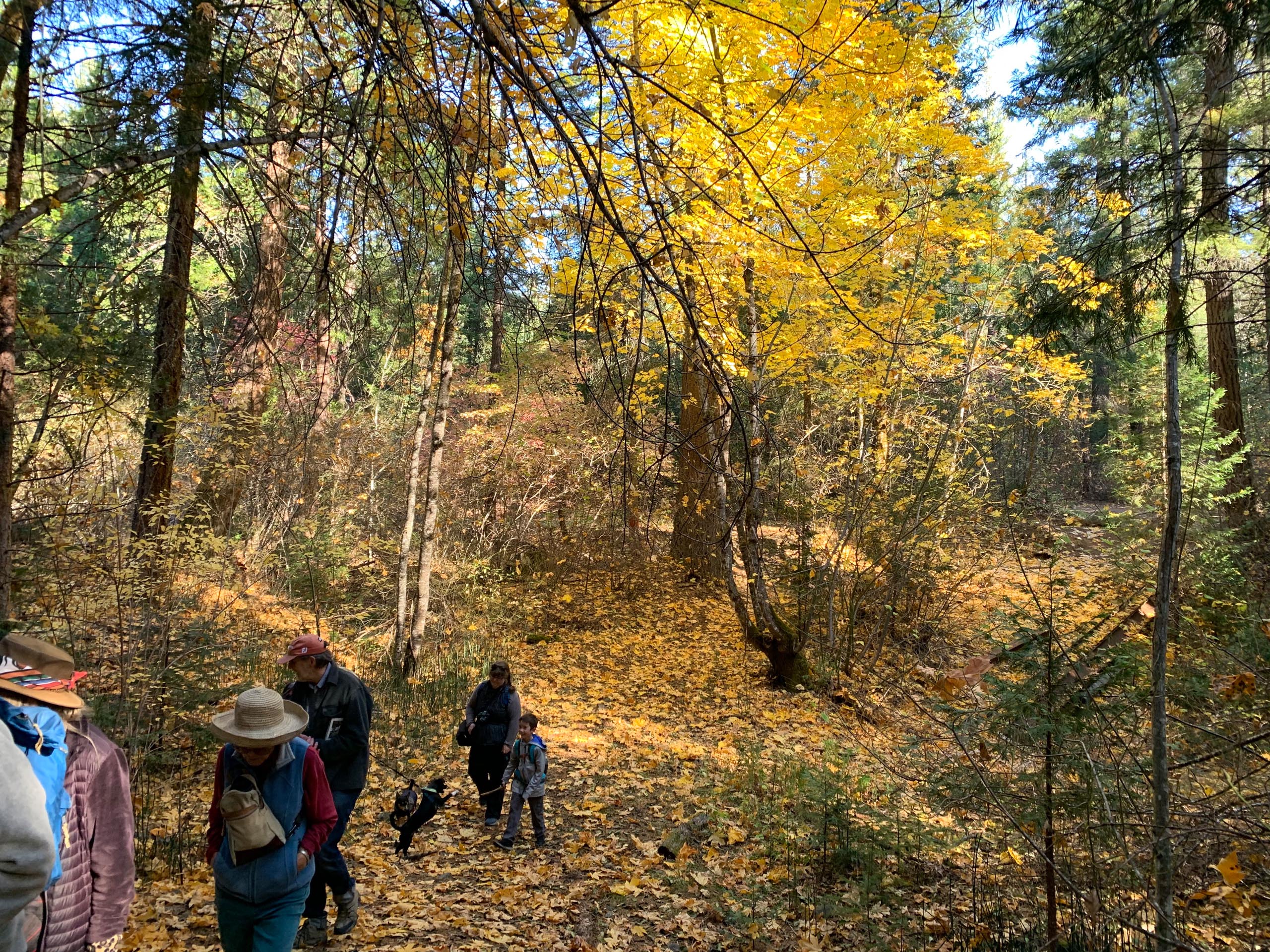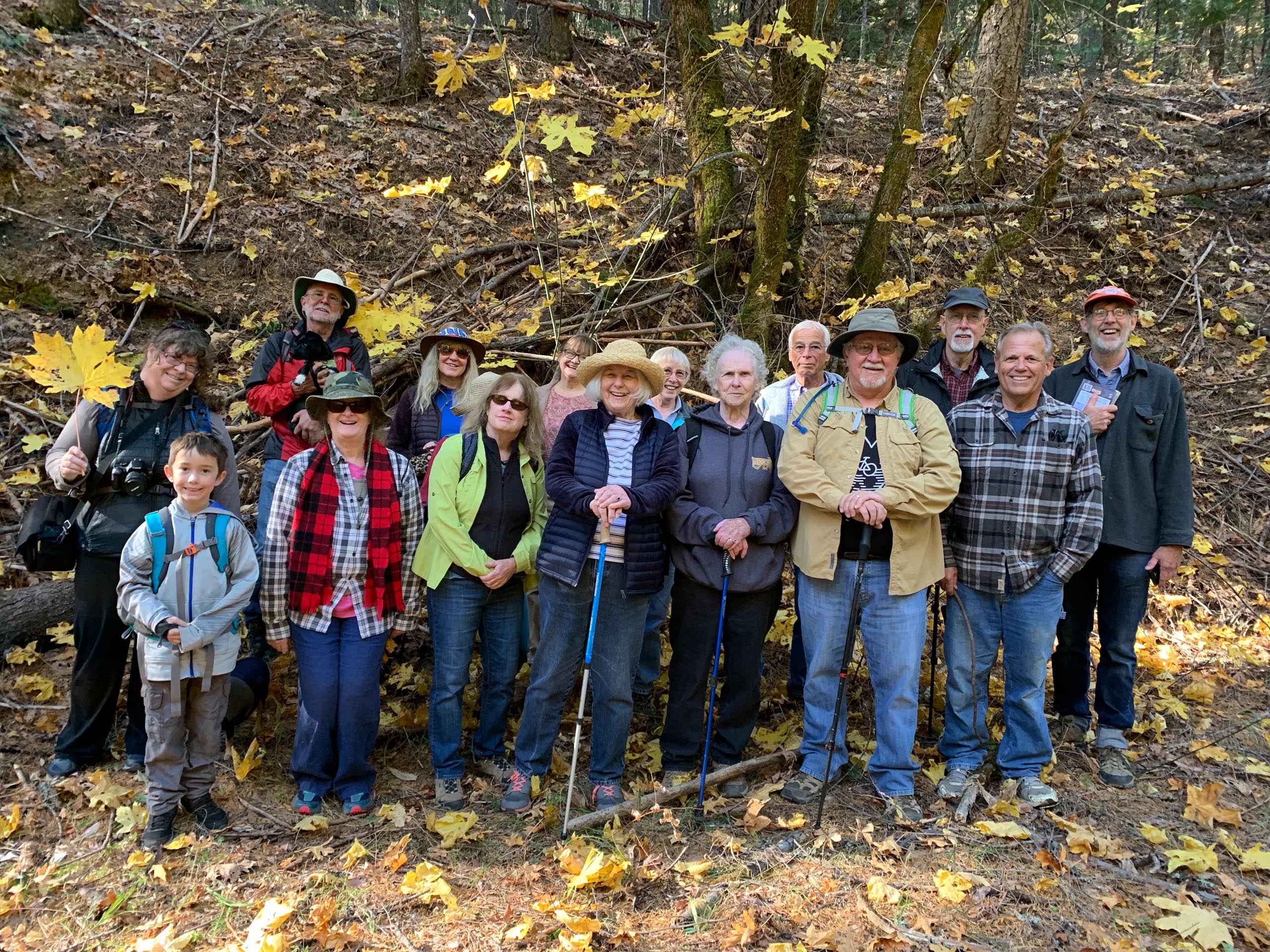 A beautiful autumn day and the prospect of fantastic colors enticed 17 participants to the trail. We saw giant yellow leaves of bigleaf maple and had a competition to find the largest leaf. Beaked hazelnut had only a few yellow leaves and no nuts, but male catkins were forming in anticipation of next year. Dogwoods glowed red and pale white. Mock orange was pale yellow, and Oregon white oak a brassy bronze. Black oak flamed gold and scarlet. Meter-long compound leaves of California spikenard were green and yellow, and some globes of dark berries persisted.