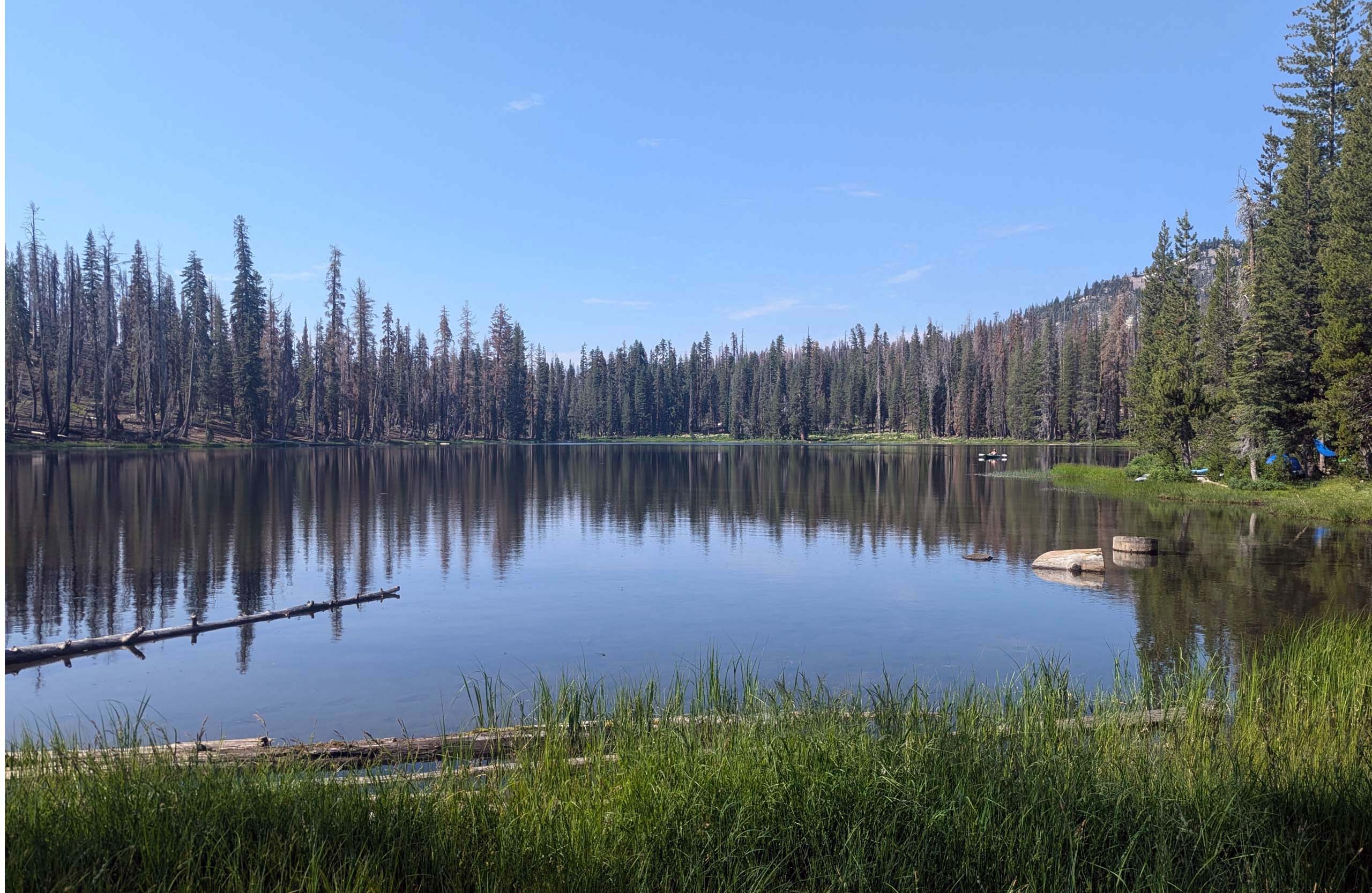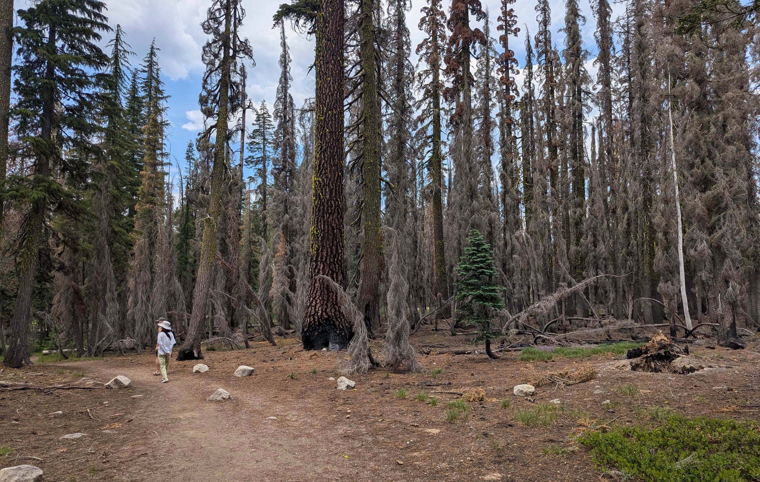 The trail down the ridge to Echo Lake burned with low severity, beneficially burning smaller and weaker trees. The area around the lake itself was not burned at all. Trees growing along the trail included mountain hemlocks, red firs, western white pines, lodgepole pines, and a few white firs.