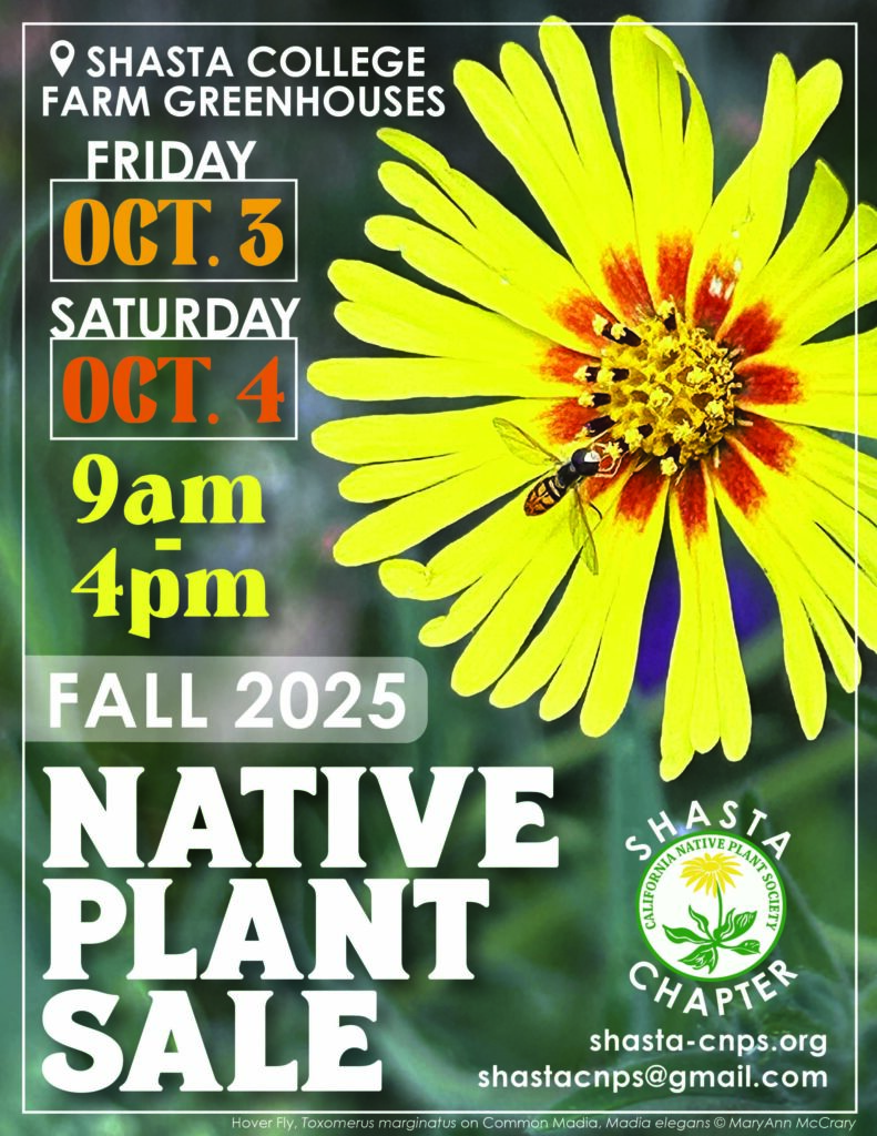 To kick-off a Happy New Water Year, our Fall 2025 Native Plant Sale is set for the first Friday and Saturday in October: October 3 & 4, 2025, at the Shasta Community College Farm greenhouses, in conjunction with Shasta College’s own plant sale. We will also hold our traditional setup and members-only pre-sale the day before. Please see our Species Availability List.