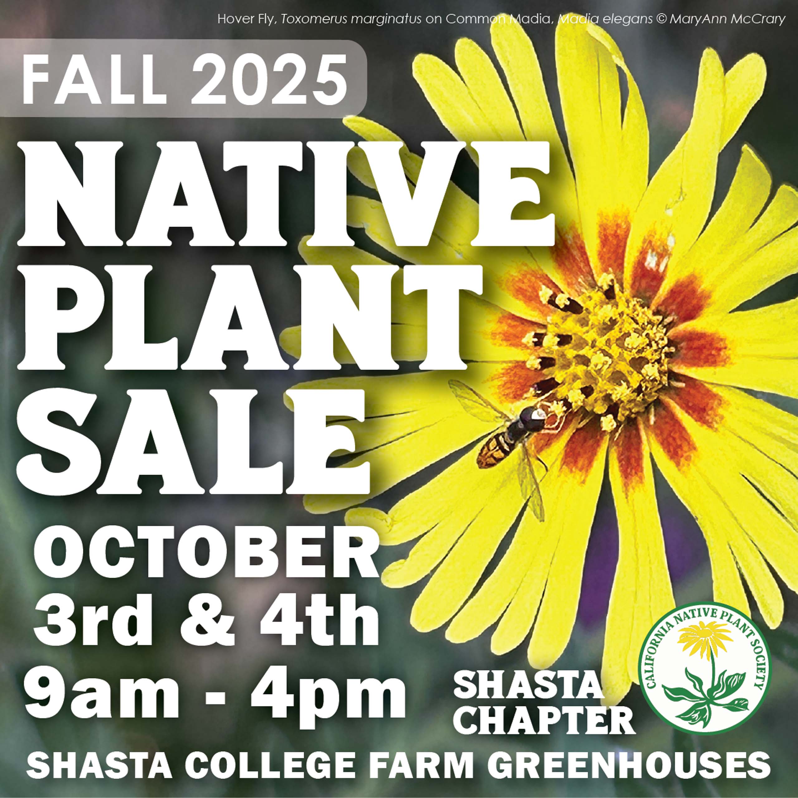 The fall-winter-early spring part of the year is, hands down, the best time of year in the Redding area for many outdoor activities, including starting and expanding native plant gardens. (Please see Nursery Happenings: October 2025 for more on pollinator gardens!) And just in time to help you out with that, we are holding our Fall 2025 Native Plant Sale this weekend, at the Shasta College Farm greenhouses! The members-only pre-sale is from 4 to 6 PM on Thursday, October 2; the public portion of our sale is both Friday and Saturday, October 3 and 4, from 9 AM to 4 PM.
