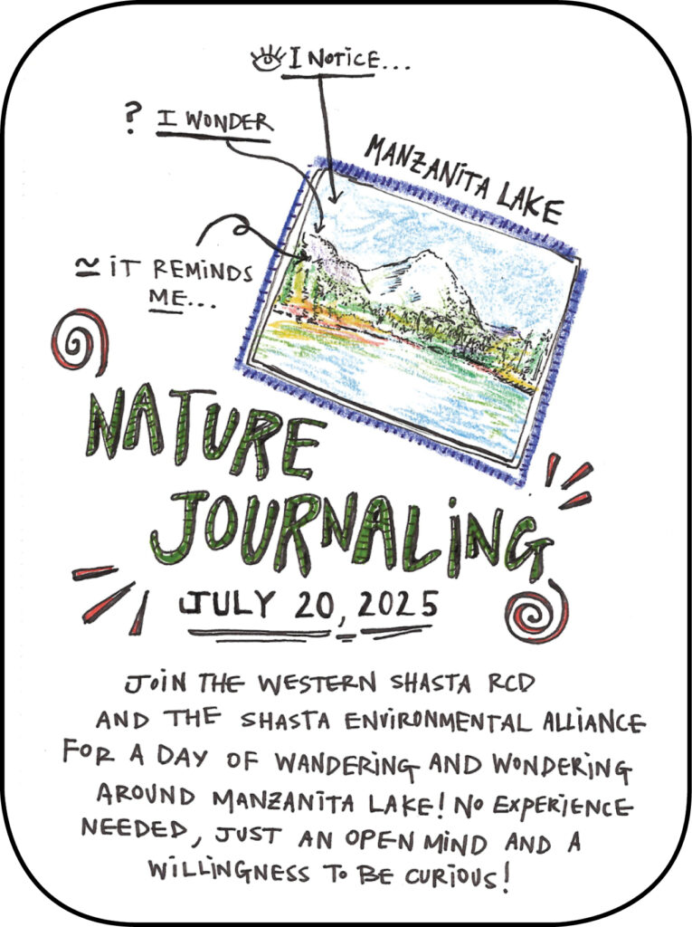 • Join Shasta Environmental Alliance (SEA) hike leader Juliet Malik, and Western Shasta Resource Conservation District’s GrizzlyCorps fellow, Heather Bortolussi, to head up to Manzanita Lake, Lassen Volcanic National Park, to explore nature journaling. This activity is open to everyone, young and old, although children under 16 must be accompanied by an adult. No drawing experience is necessary, but it is recommended that you bring your own sketchbook and a pencil. Other art materials will be available to share. Additional activities may include a short walk, sniffing the Jeffrey pines for their delicious vanilla/butterscotch scent, and zine making. Bring a lunch, water, hat, and sunscreen, but most importantly, bring your curiosity!
