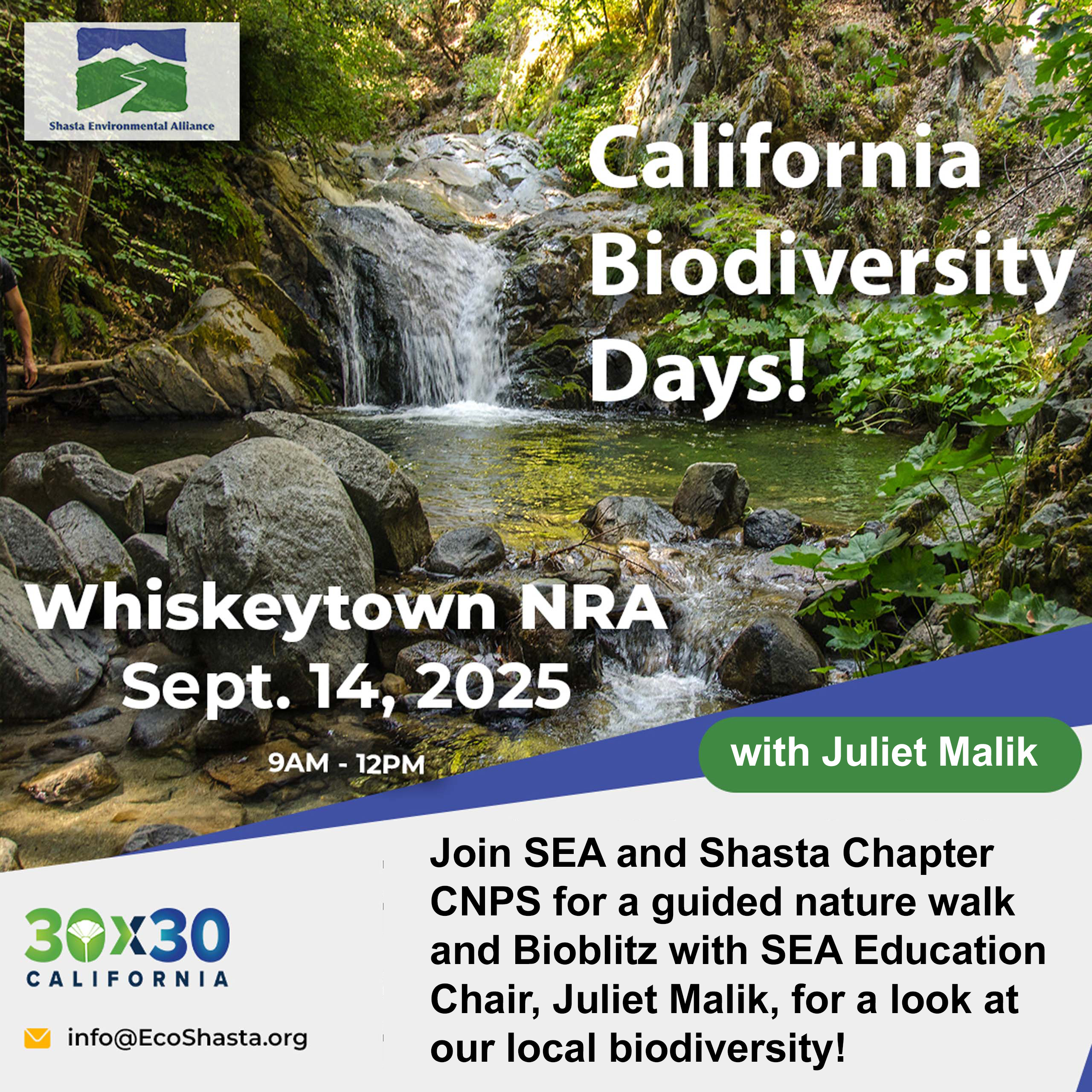 - Shasta Environmental Alliance is pleased to host its third annual BioBlitz event to celebrate California Biodiversity Days. Join SEA Board Member Juliet Malik and fellow California Naturalist Holly White-Wolfe at Whiskeytown for a day of observing and documenting the many plants, fungi, animals, and insects that call this national recreation area home, via an iNaturalist BioBlitz.