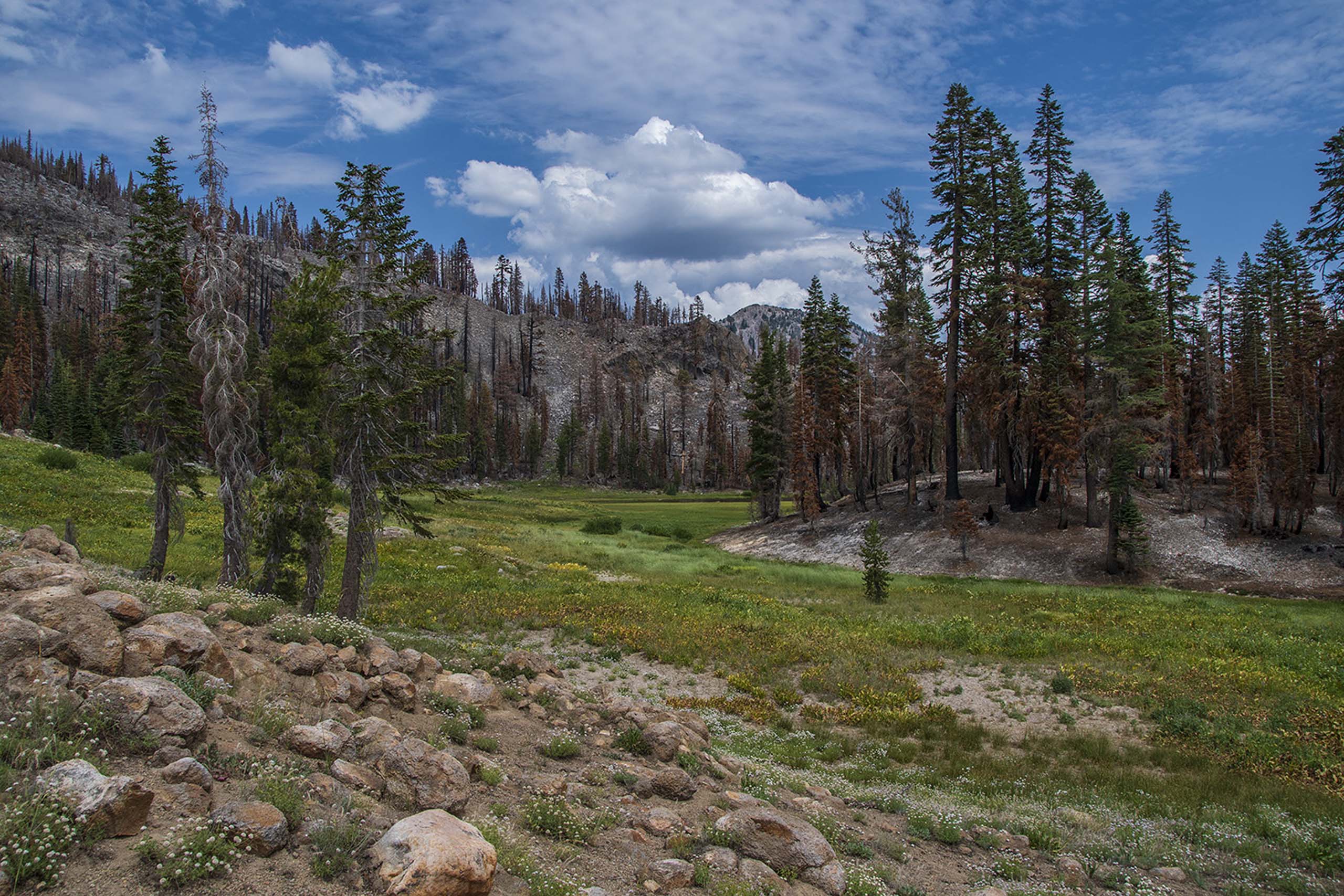 Looking up the drainage toward Cold Boiling Lake; the trail traversing behind the lake. There is fire damage, but it was probably healthy to burn some of this stuff. Lassen Volcanic National Park, July 31, 2022.