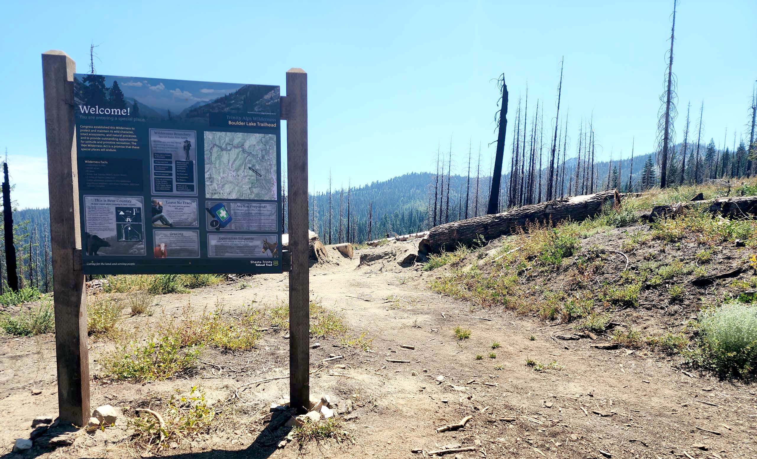 If you would like a taste of the Trinity Alps without too much strenuous effort, try Boulder Lakes Trail, just north of Trinity Center. Known as one of the easiest trails in the Trinity Alps Wilderness, Boulder Lakes Trail will lead you to Boulder Lake (586-foot elevation gain) or Little Boulder Lake (687-foot elevation gain), within ~1.75 miles to either (3.5 miles round trip).