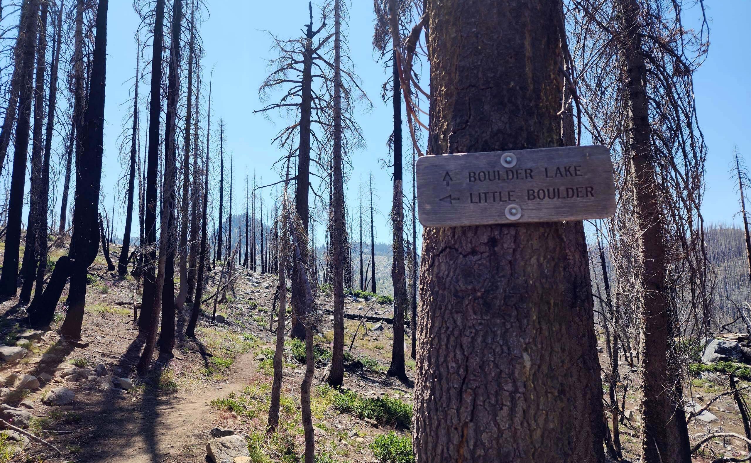 The side trail to Little Boulder Lake does get out of the burn after ~0.25 miles, and the rest of the way is beautifully forested.