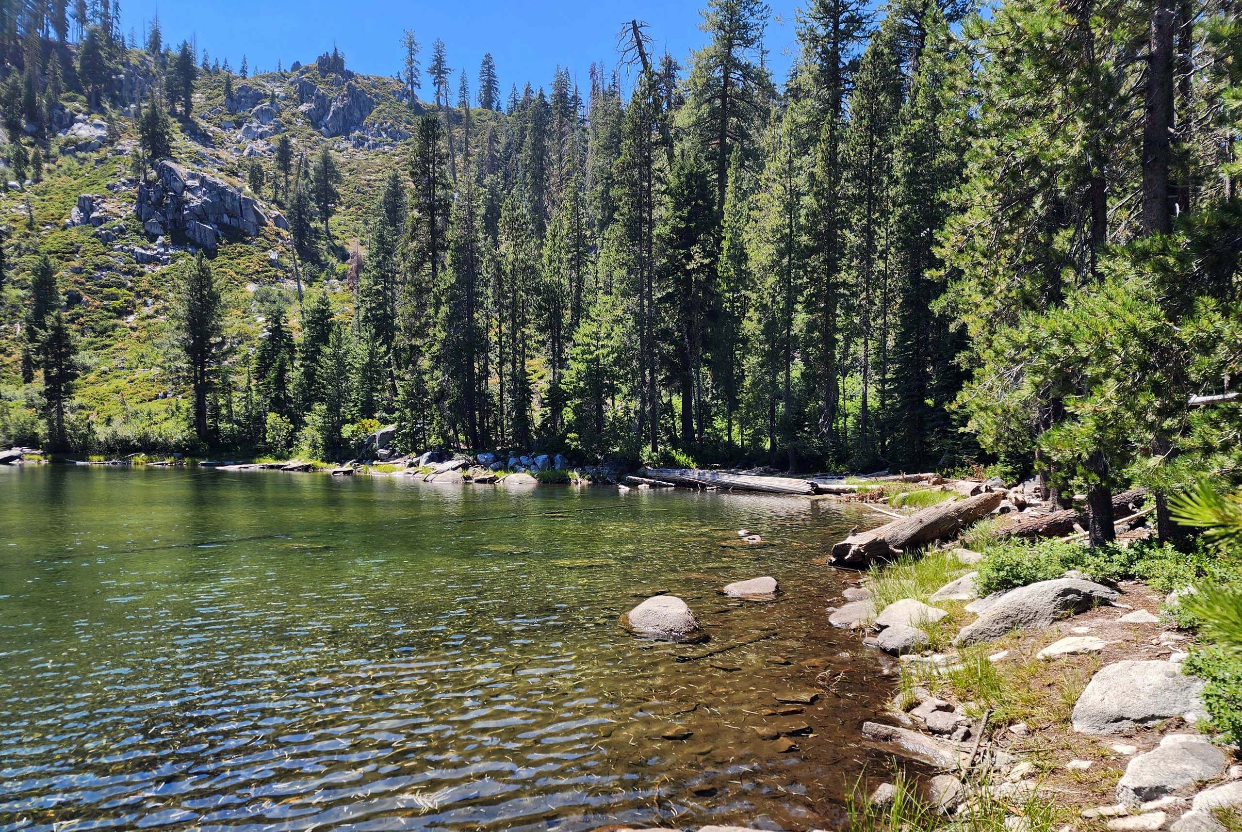 Little Boulder Lake, while quite small, definitely fits the description of the typical Trinity Alps lake. Nestled against impressive granite slopes and ringed by shore-crowding shrubs, we had no doubt that we were in the Trinities. There are a couple campsites here as well, but they mostly used as overflow when Boulder Lake campsites are full.