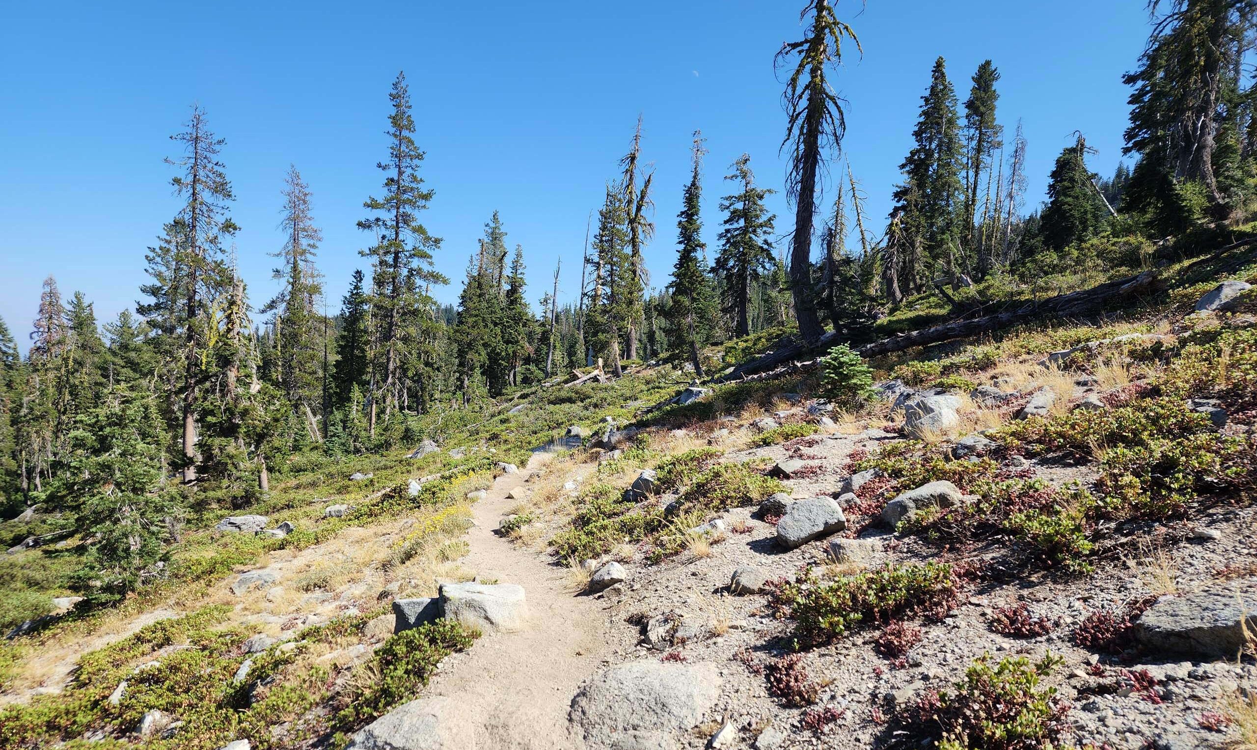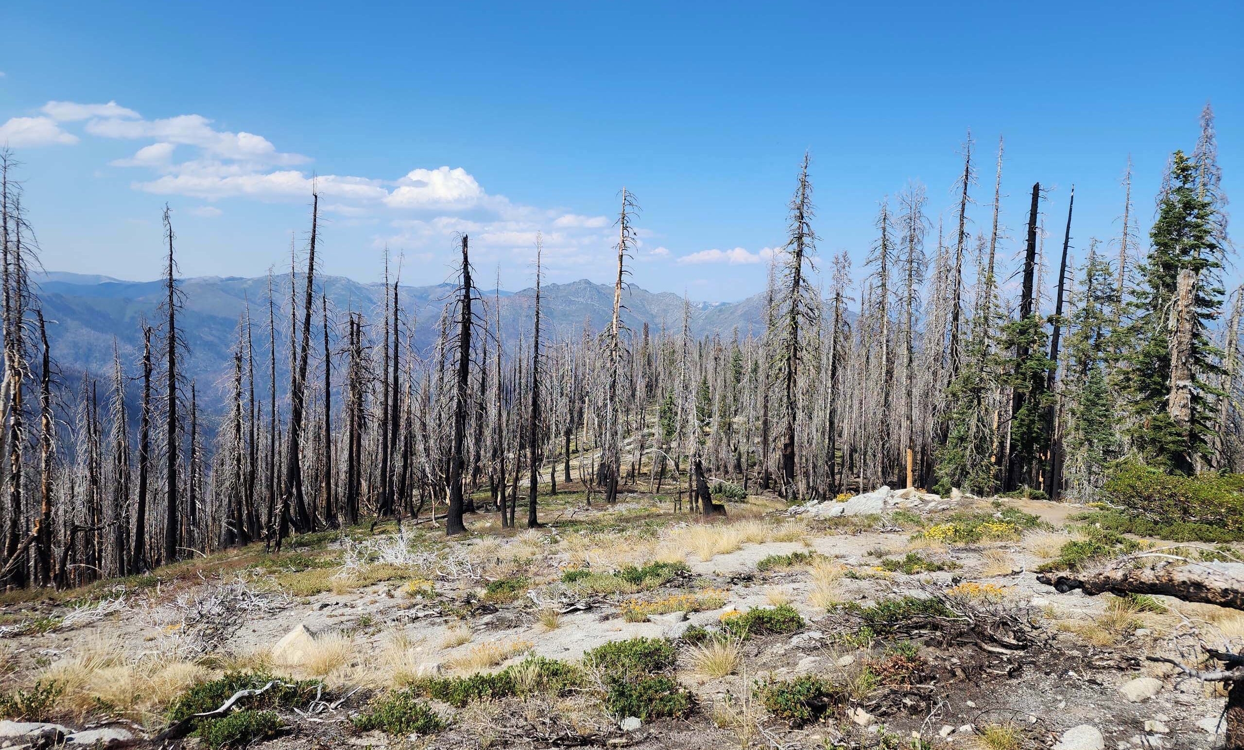 The trail divides at ~0.5 miles from either lake. Up to that point, a great deal of the landscape had been burned in the River Complex fires of 2021. There is some intact, open forest along the main section of trail, but much of it is burned.
