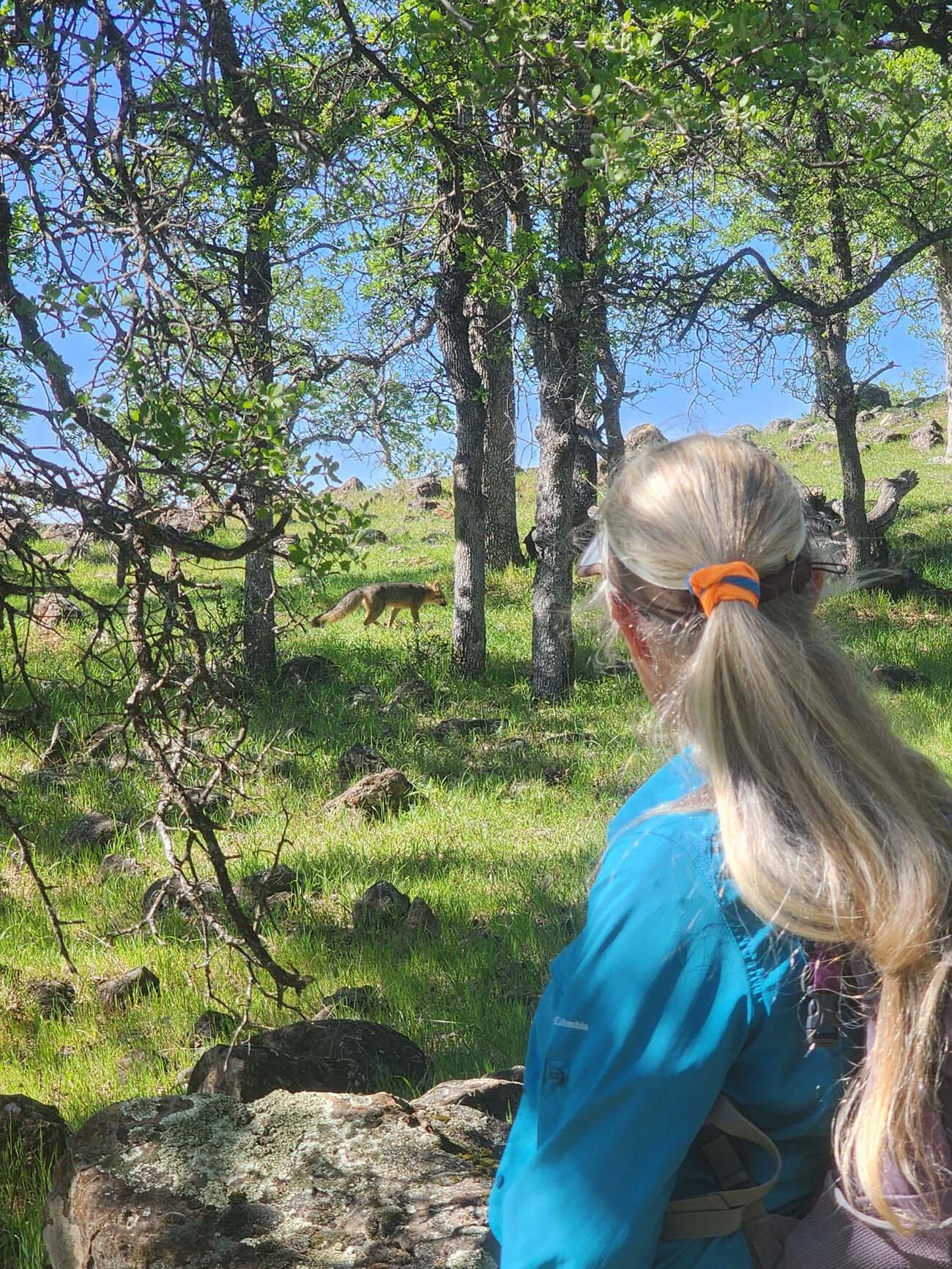 Off-trail hiking is one of our very favorite things to do. This is where we see the coolest sights, like dwarf pearlwort, masses of babystars, little miner’s-lettuce, and gray foxes! Our hike that day took us to the northern boundary of the recreation area, which we followed east into a corridor that would eventually get us to Battle Creek Wildlife Area. But we did not go nearly that far. Instead, we climbed up a wash to a ridge where we had lunch, hiked down the ridge to another wash, and followed that back, almost to the trailhead. The few people we saw were no more than specks in the distance.