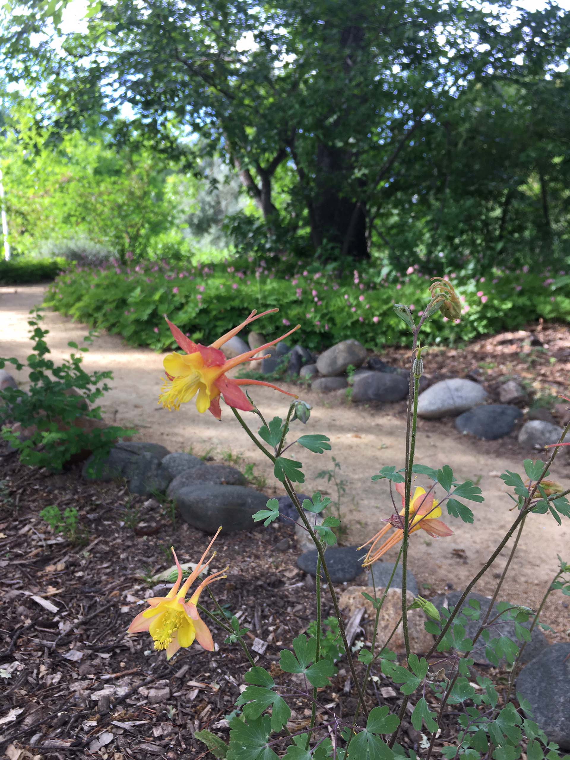 Western columbine, Aquilegia formosa, in bloom at the Matson-Mowder-Howe Celebration Garden, on April 28, 2020. Photo by Sarah Jarrett.