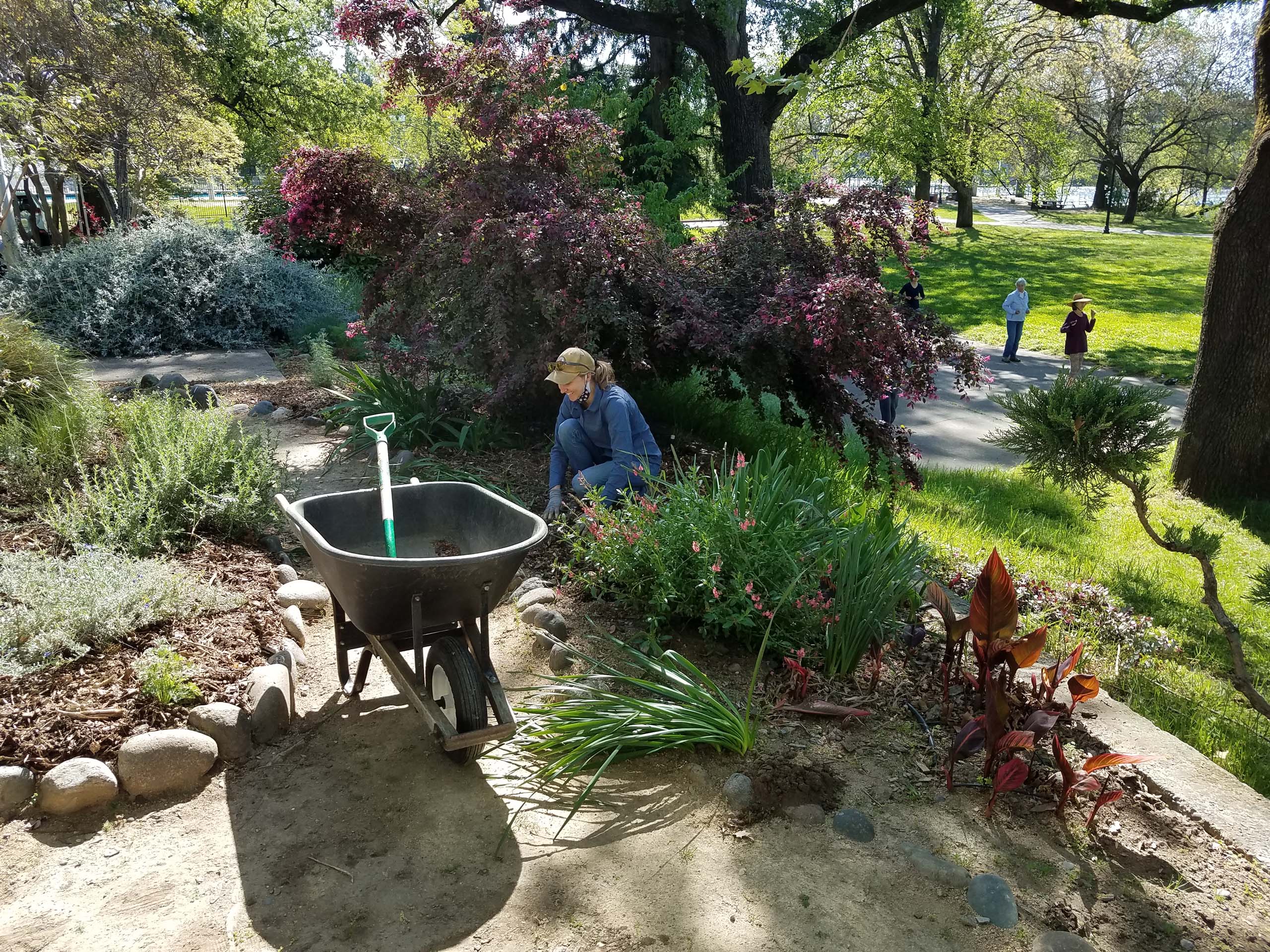 The collaboration continues at the Matson Mowder Howe Celebration Garden. April 10 was another fine day in Redding that brought together members from the Shasta Chapter CNPS (Sarah Jarrett, Chris Gray, and Shirley Martin), Shasta Master Gardeners (Tamlyn Faris and Kim Stempien), dual CNPS and Master Gardeners (Jan Carter, Kay Gibson, and yours truly), and North Valley Art League (Sue Mandel).