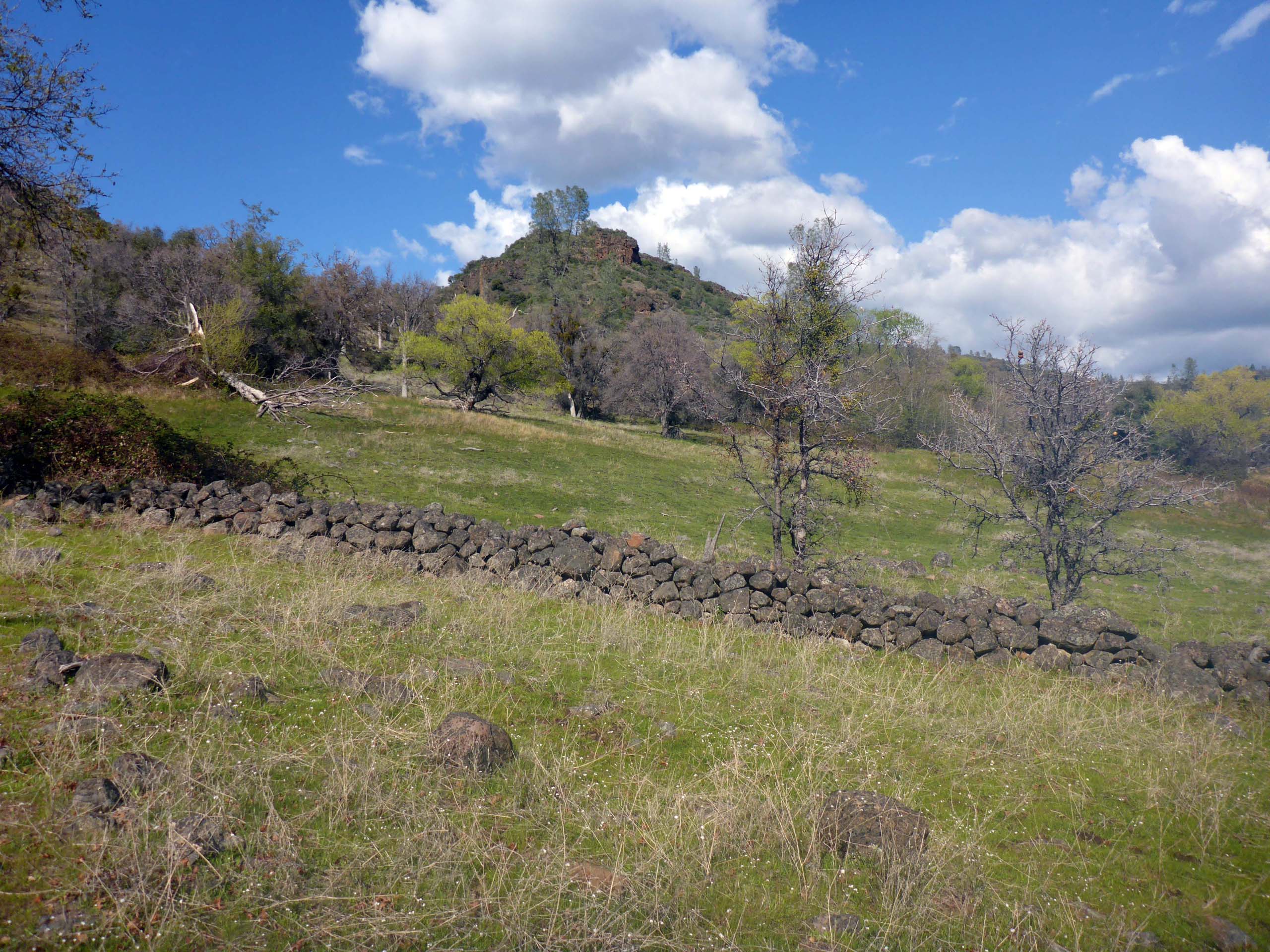 The trail ends at the historic McClure cabin site, after which the trail was named. There are a few artifacts remaining there, including an old hay rake, a rock wall, and vestiges of fencing. There used to be a sign inscribed “McClure Place,” but we either missed it or it’s now gone. But you don’t need a sign to realize that this was once a place of intensive human activity.