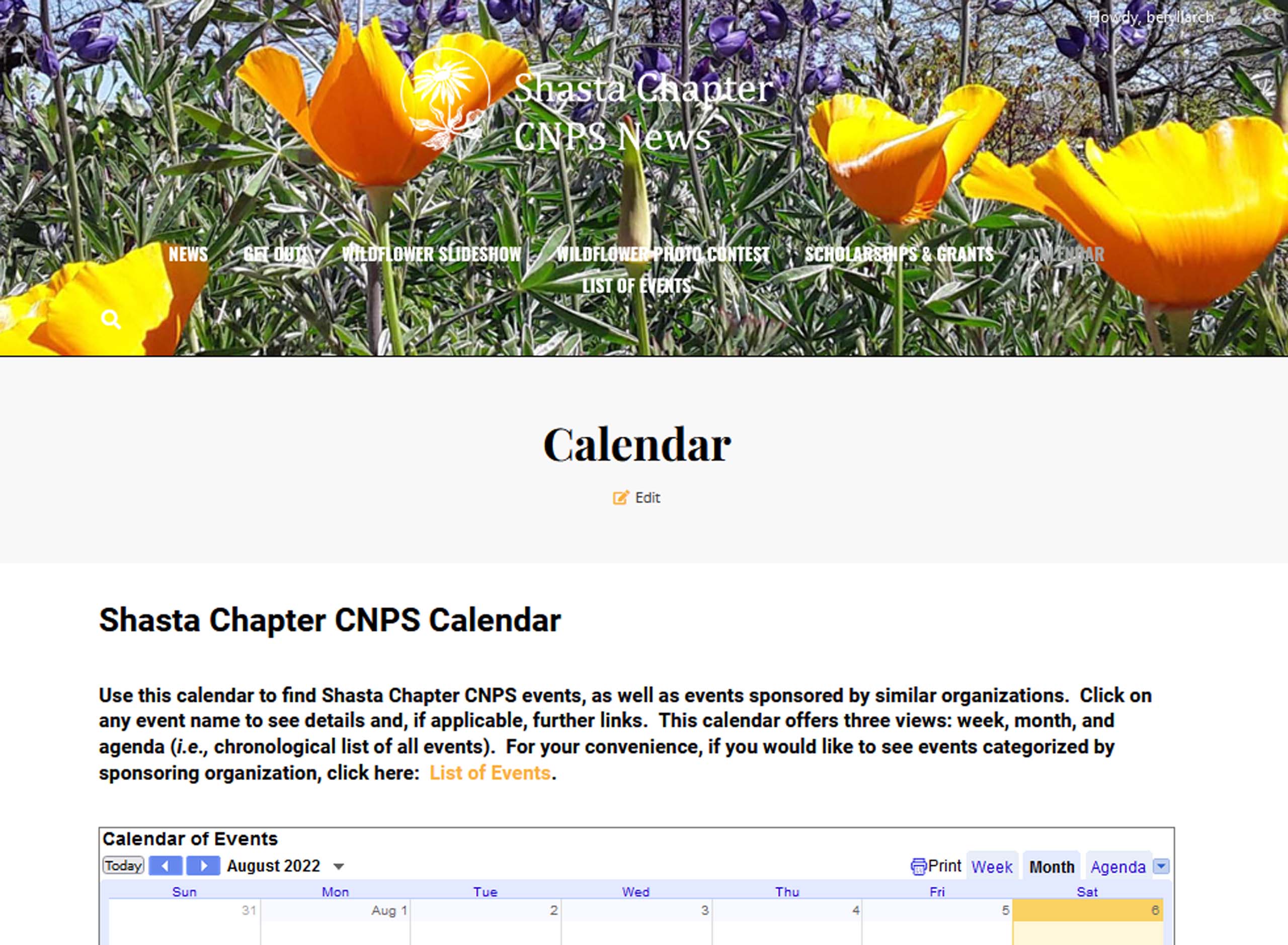 In the meantime, you can check out a couple exciting new additions right here on this blog site: we now have a real, live Calendar! We’ve needed a good working calendar since Day One; 2.5 years later, thanks primarily to José Hernández, we finally have one! To augment the calendar page, we also have a new page called List of Events. Here you can see at a glance what Shasta Chapter and select other groups are up to.
