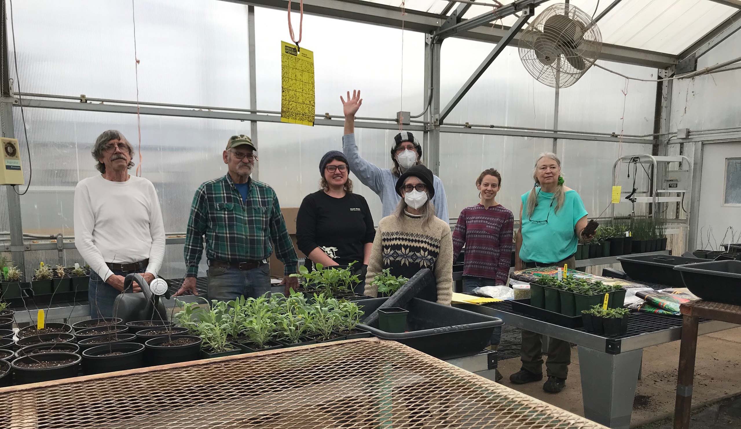 January 2023 propagators: (left to right) Chris Gray, Ed Thomas, Jana Peters, John Springer (back), Mary Ann McCrary (front), Caitlin French, and Catherine McNeight. Photo taken on January 8, 2023, in a Shasta College greenhouse by Susan Libonati-Barnes.