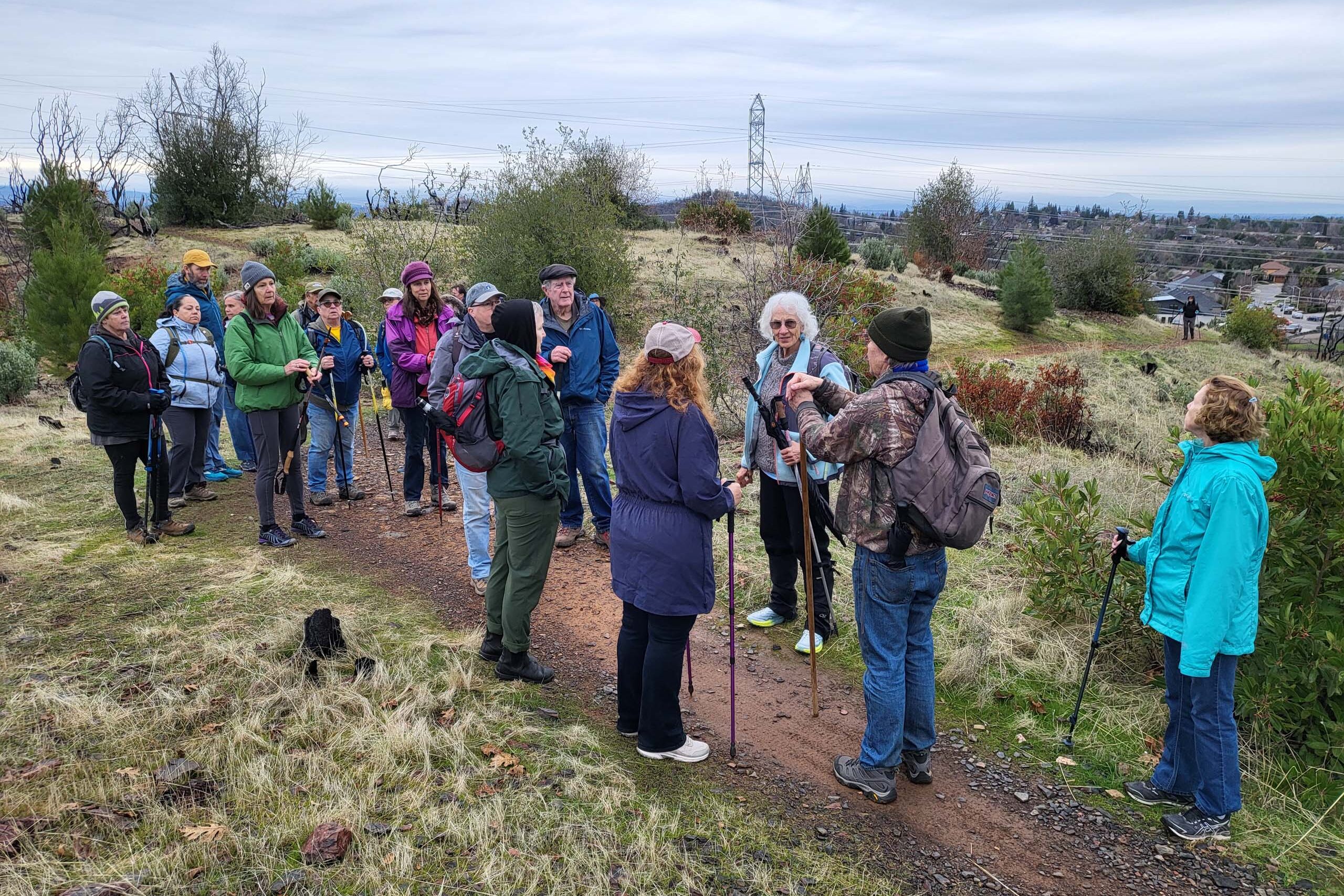 We had yet another great turnout for our annual Shasta Chapter CNPS/Shasta Environmental Alliance field trip up Redding’s Westside Trail to the “Top of the World,” the highest hill in the trail complex. With 31 people, we had a wide range of physical abilities, so after the first mile the group began to spread out over the trail. Eventually most of the group made it to the top where we shared some wine and a toast to the New Year.