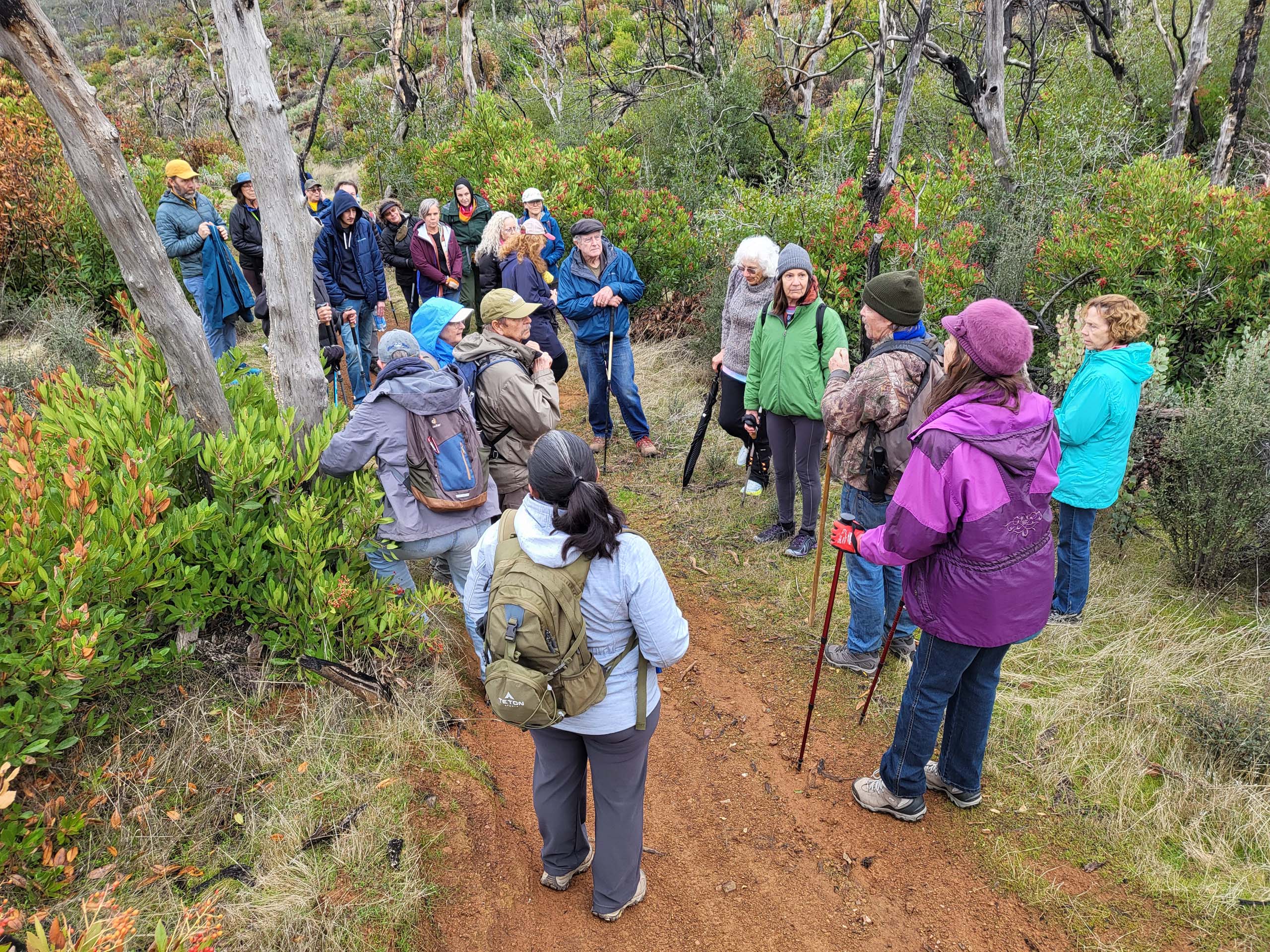 David Ledger, third from right, discussing habitat renewal after the Carr Fire on Redding’s Westside Trail. Note the dead oaks amidst prolifically resprouting toyon with its red berries.