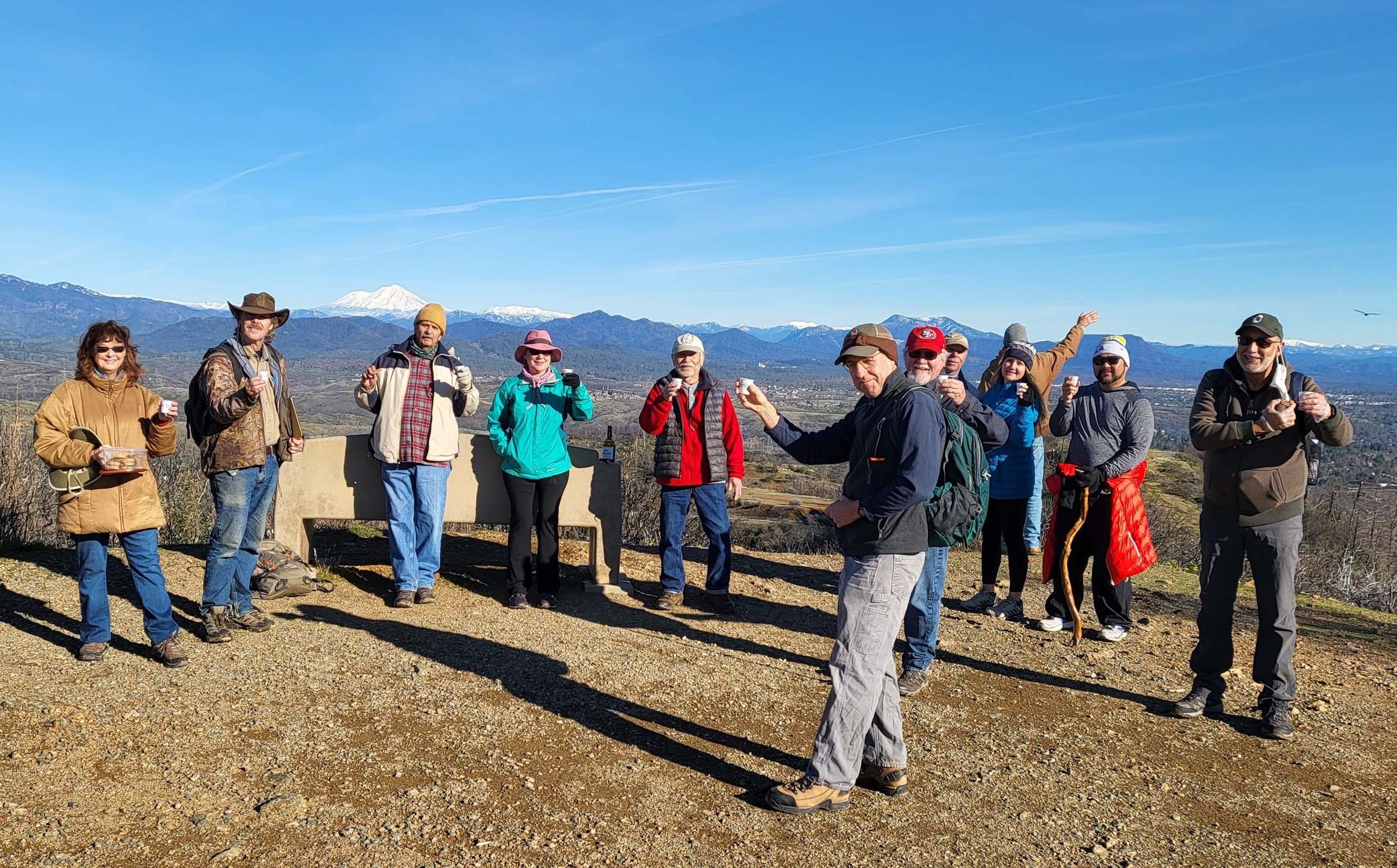 On this cold but clear New Year’s Day, we had amazing views of Mt. Shasta, Mt. Lassen, the Trinity Alps, the Yolla Bolly Mountains, the northern Sierras, and about 100 miles down the Sacramento Valley. Lisa Ross brought homemade cookies, Doug Mandel and José Hernández took some great photos, and Yo Sadohara brought wine for a toast to ring in 2022. ~David Ledger