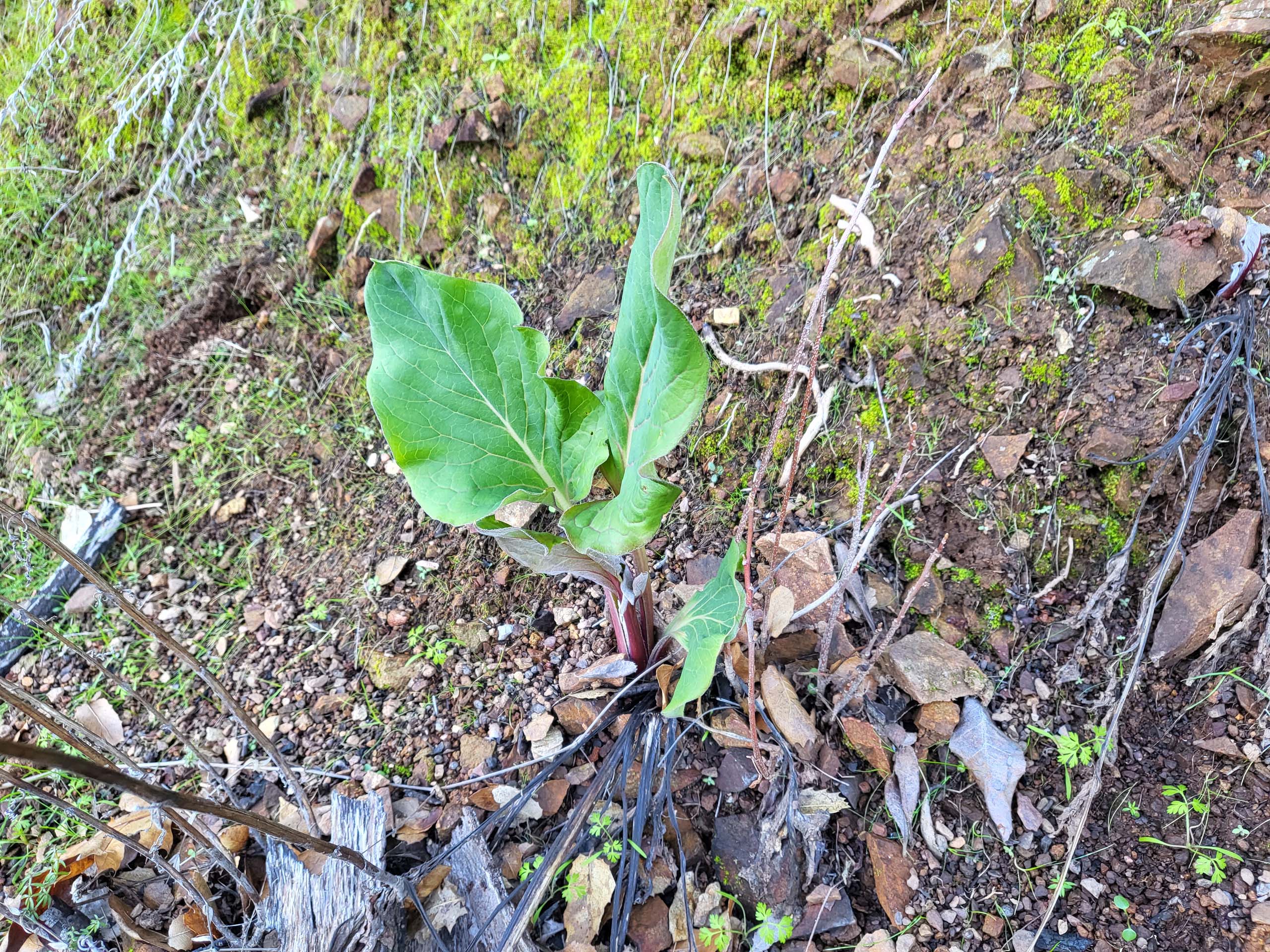 Only the coyote-brush (Baccharis pilularis), white-leaved manzanita (Arctostaphylos viscida ssp. viscida), and scattered fragrant cudweed (Pseudognaphalium beneolens) were in bloom, but many plants were identified by their leaves, last year’s seeds, and growth form, such as buckbrush (Ceanothus cuneatus var. cuneatus), Pacific hound’s-tongue (Cynoglossum grande), and gold-backed fern (Pentagramma triangularis ssp. triangularis). Toyon (Heteromeles arbutifolia) was prolific on the trail, its bright red berries providing food for robins, bluebirds, and bears.