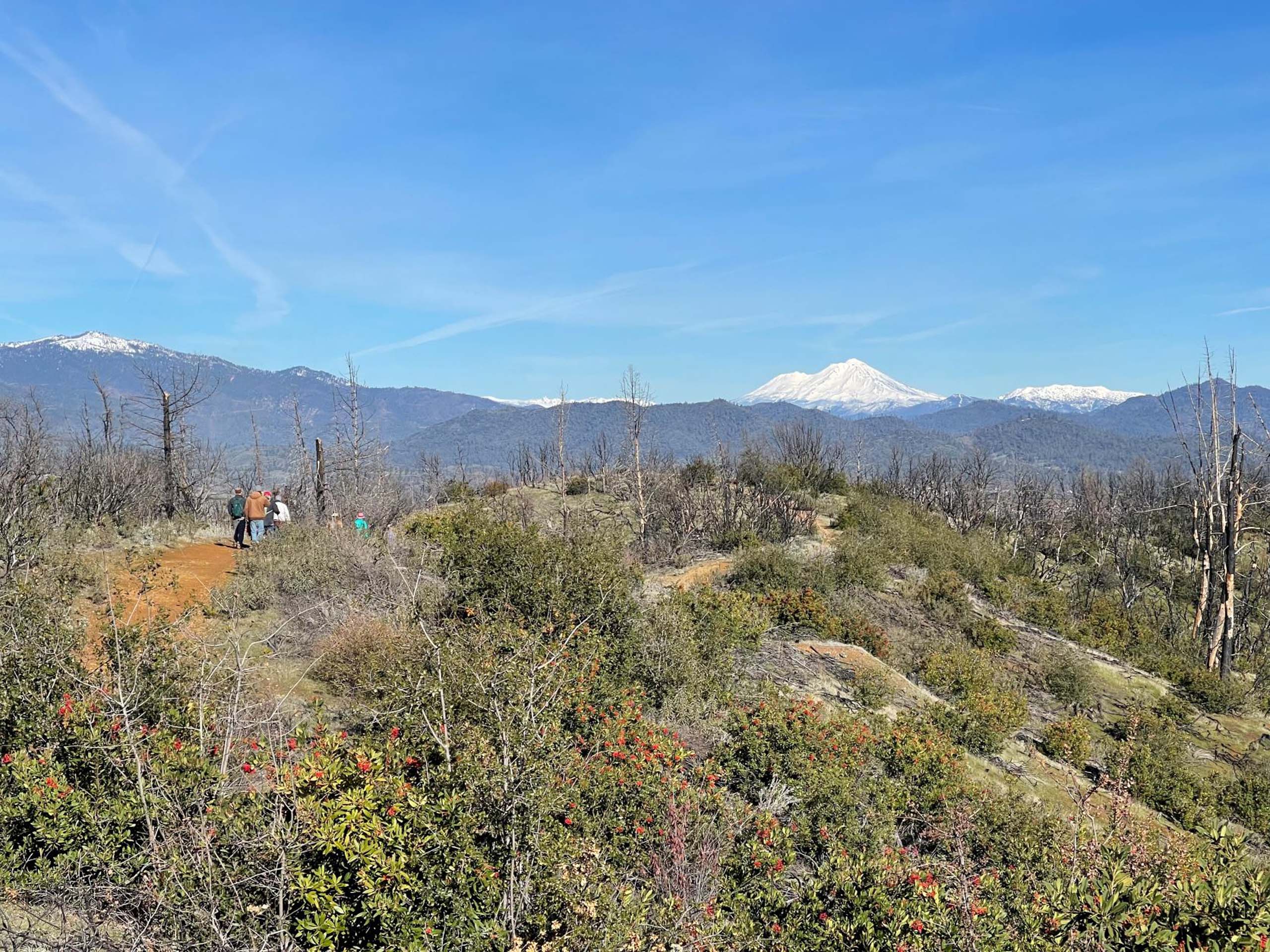 Shasta Environmental Alliance (SEA) held its first field trip of the year on New Year’s Day. Fifteen hikers showed up at 9 AM in 39 ºF weather to take this four-mile round-trip hike up Westside Trail to the “Top of the World” in west Redding. On the way, walk leader David Ledger identified many of the trees, shrubs, and herbaceous plants along the trail, all of which are nicely recovering from the Carr Fire.