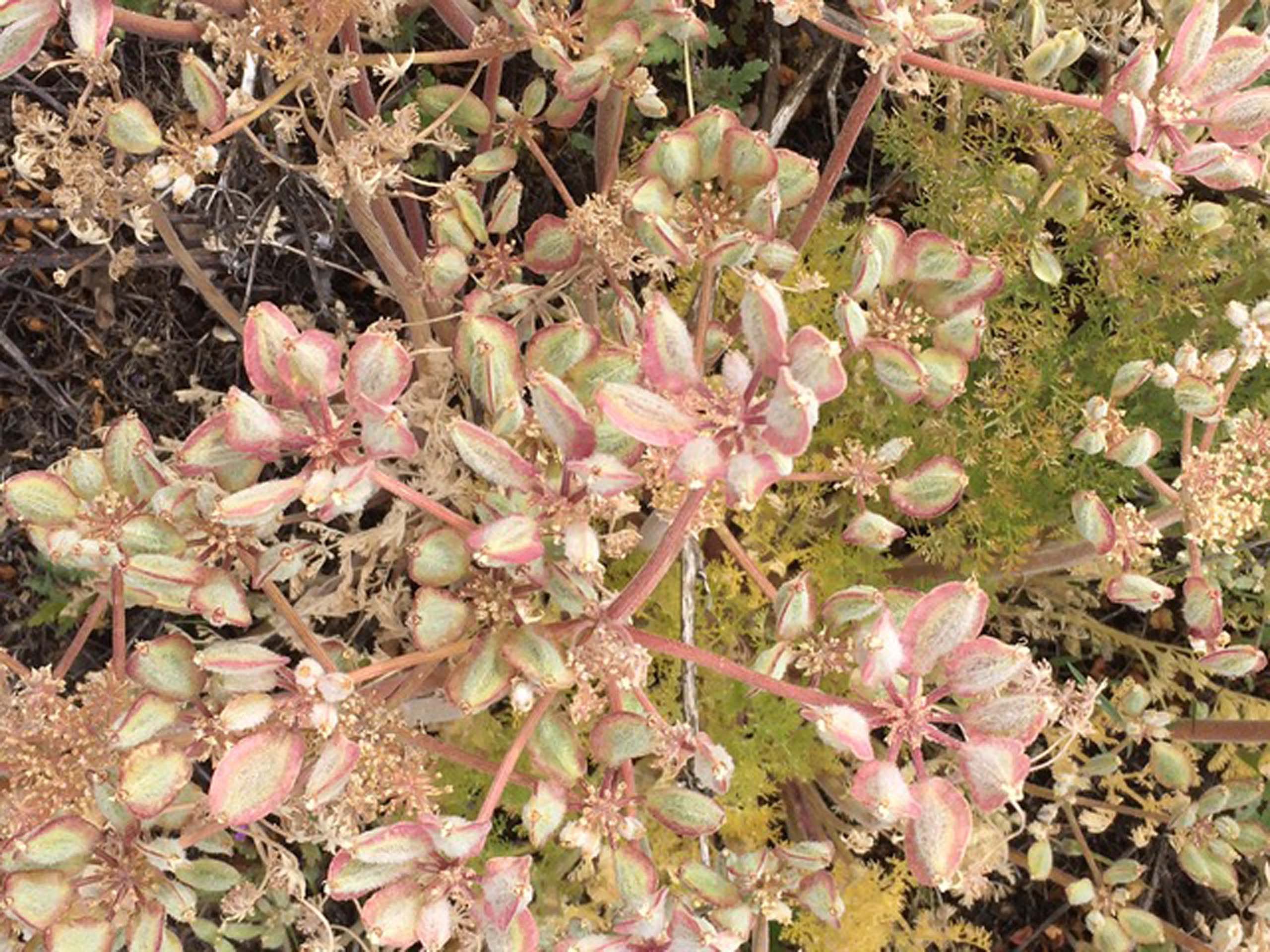 Woolly fruited lomatium, Lomatium dasycarpum ssp. tomentosum, developing pink-edged fruit and pedicels on May 8, 2022. The lacy leaves, below, were turning golden. Photo by MaryAnn McCrary.