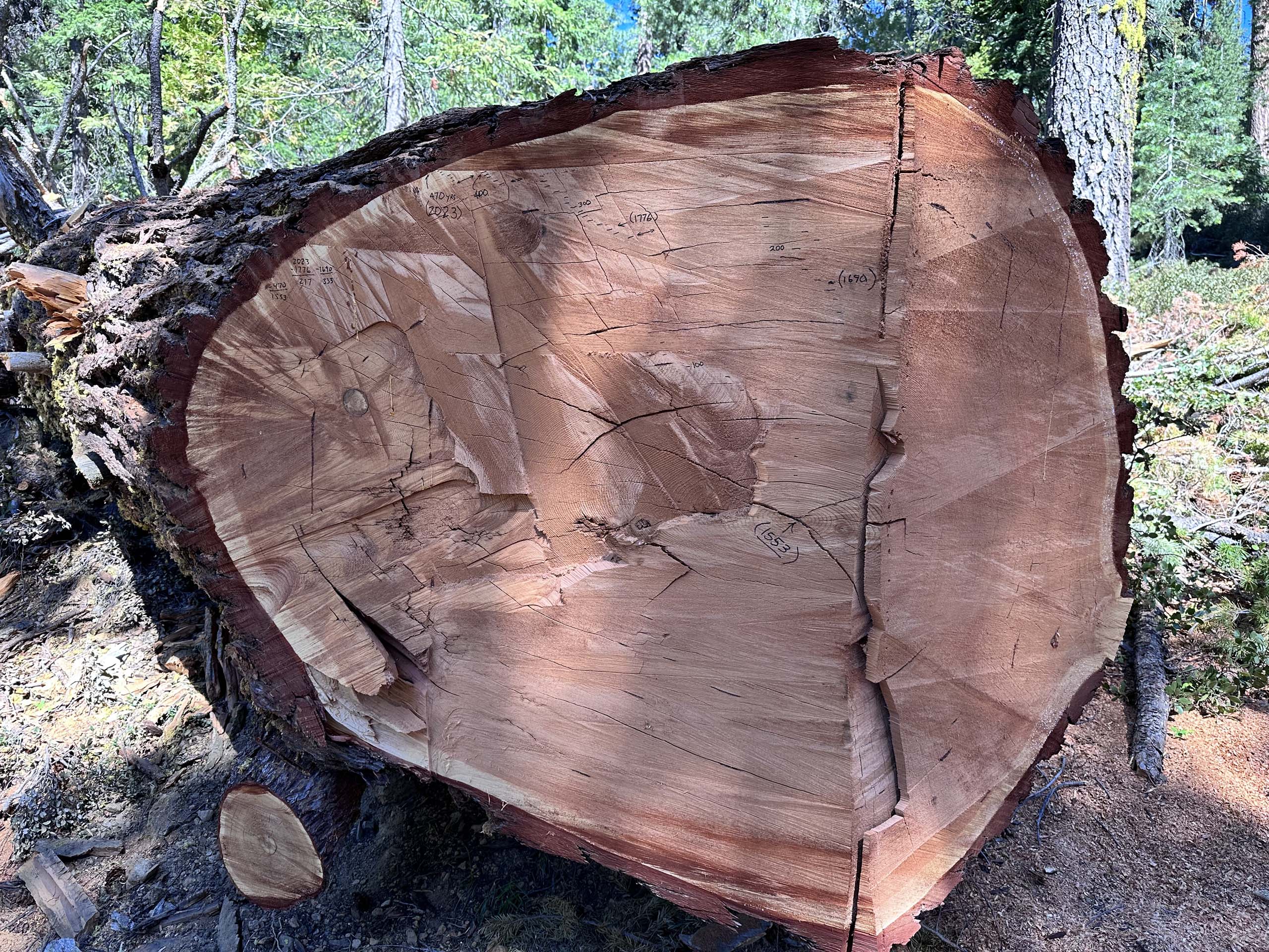 Cut red fir with some of its rings identified. This tree would have been 470 years old when it was cut.