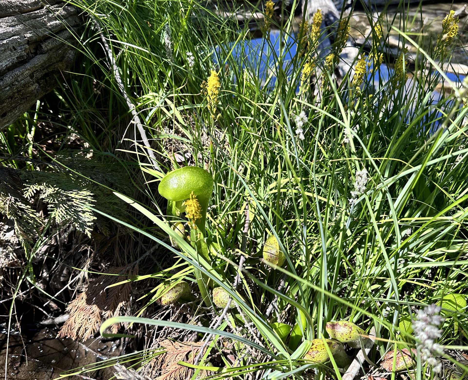 Pitcherplant, Darlingtonia sp.; yellow spikes of California bog-asphodel, Narthecium californicum; and white hastingsia, Hastingsia alba, all growing at the lake edge. Photo taken July 29, 2023, by Amy Henderson.