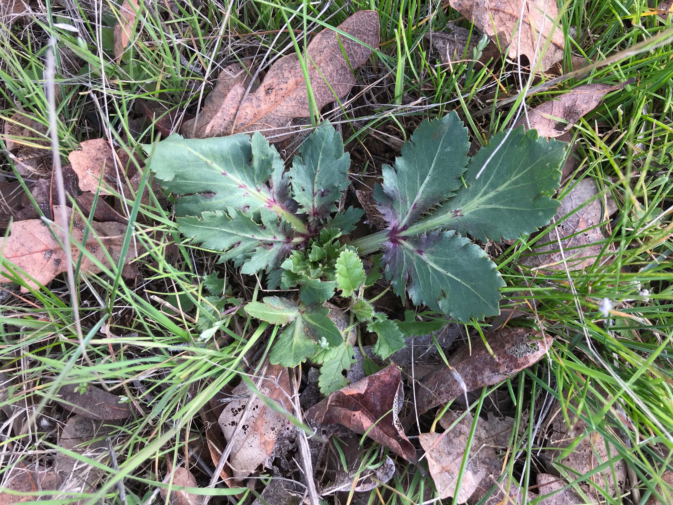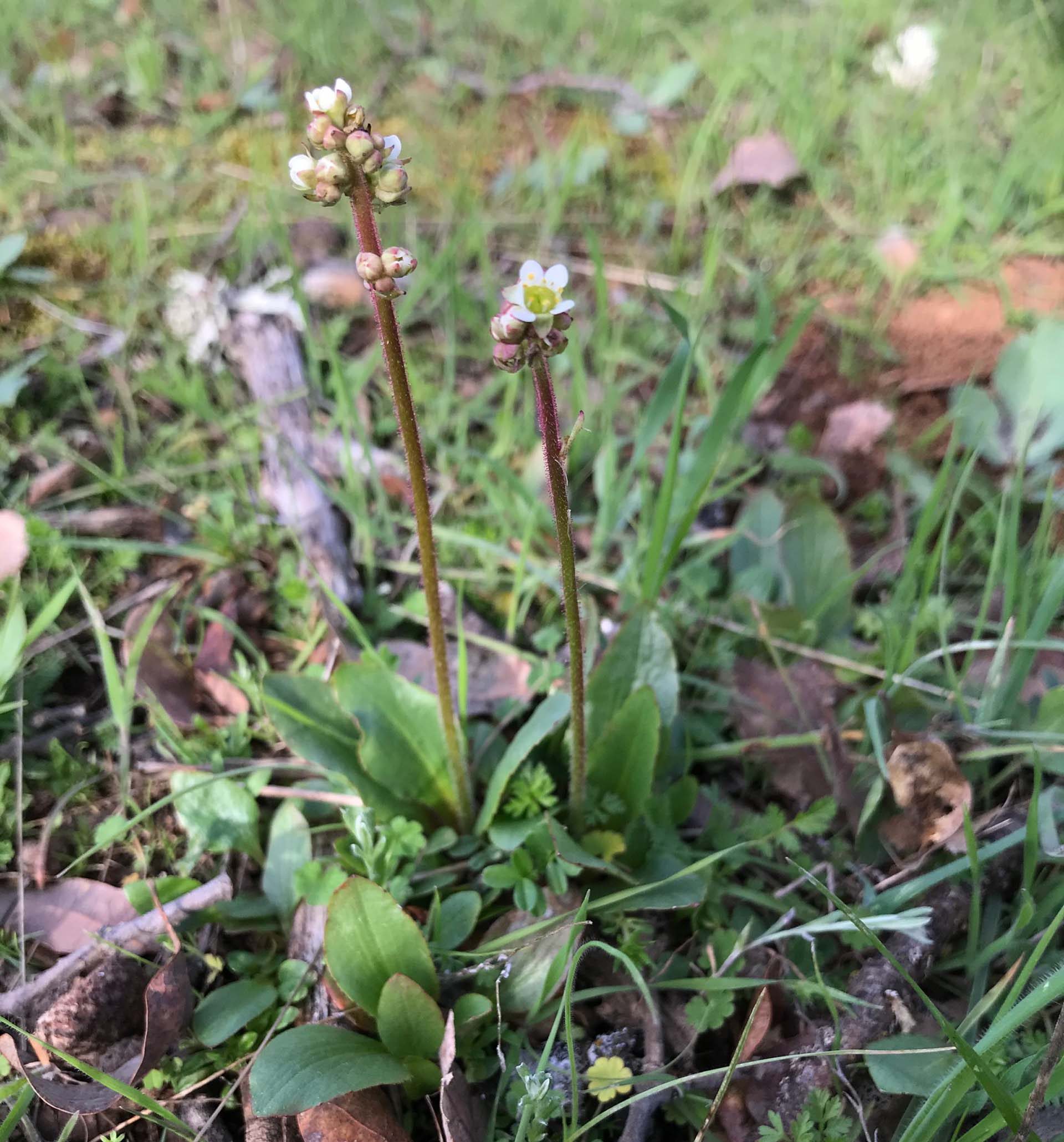 I like to take a stroll through Parkville Cemetery in Anderson at this time of year. Yesterday, the Lewis’ Woodpeckers were active, and so were the earliest wildflowers. I saw soap-plant leaves, appropriately wavy; purple sanicle, appropriately bipinnatifid (don’t blame me for the name); and spring saxifrage. Yellow-carpets (Blennosperma nanum) and redmaids (Calandrinia menziesii) were also blooming.