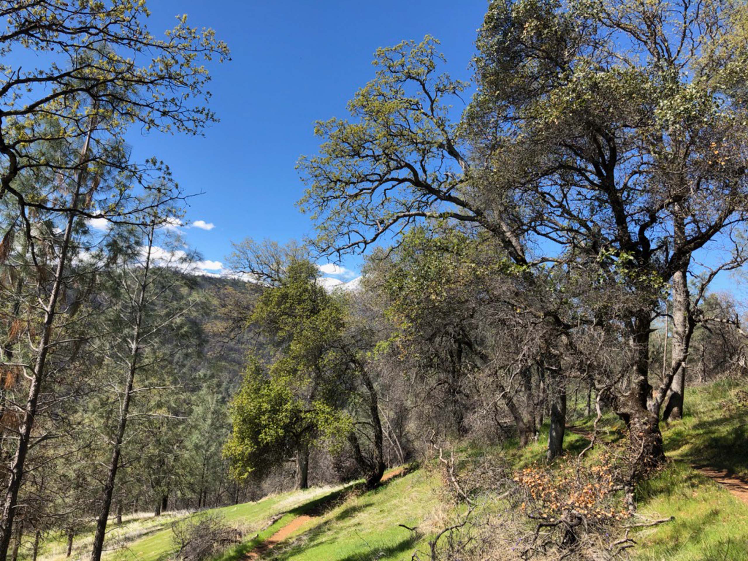 To get there, drive west on Placer Street toward Igo until you come to Muletown Road. Turn right and proceed for a bit less than half a mile until you see the Oak Knoll parking area on the left-hand side of the road. Park, then cross the road and begin a beautiful walk on the dirt trail that gradually winds uphill. About a quarter of a mile into the walk, there is a trail sign that shows the Princess Ditch Trail to the left. There is an elevation gain of about 300 feet over the first one and one-half miles before the trail tops out and leads you downward to a small stream. This is about the two-mile mark and is where Baxster and I turned around and headed back.